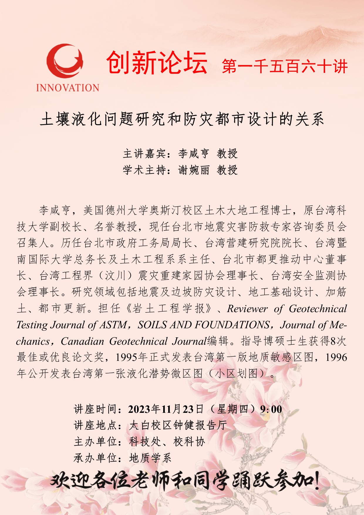 李咸亨 教授 welcome欢迎光临威尼斯集团创新论坛第一千五百六十讲:土壤液化问题研究和防灾都市设计的关系 讲座时间 2023年11月23日(星期四)9:00 讲座地点 太白校区钟健报告厅 讲座人介绍 李咸亨 教授 讲座内容
