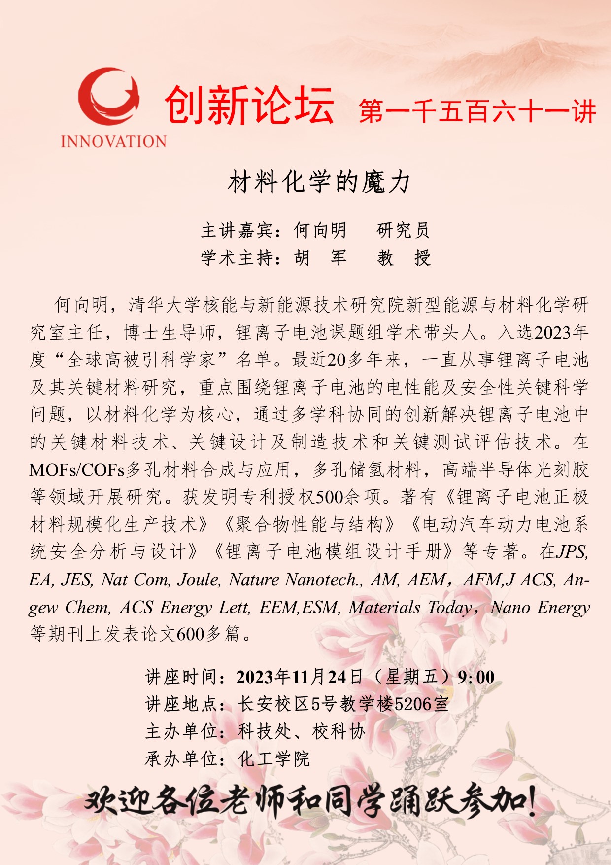 何向明 研究员 welcome欢迎光临威尼斯集团创新论坛第一千五百六十一讲:材料化学的魔力 讲座时间 2023年11月24日(星期五)9:00 讲座地点 长安校区5号教学楼5206室 讲座人介绍 何向明 研究员 讲座内容