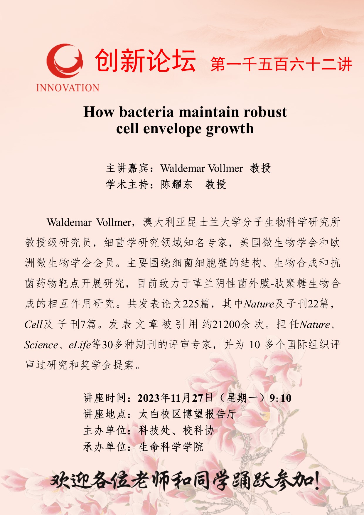 Waldemar Vollmer 教授 welcome欢迎光临威尼斯集团创新论坛第一千五百六十二讲:How bacteria maintain robust cell envelope growth 讲座时间 2023年11月27日(星期一)9:10 讲座地点 太白校区博望报告厅 讲座人介绍 Waldemar Vollmer 教授 讲座内容