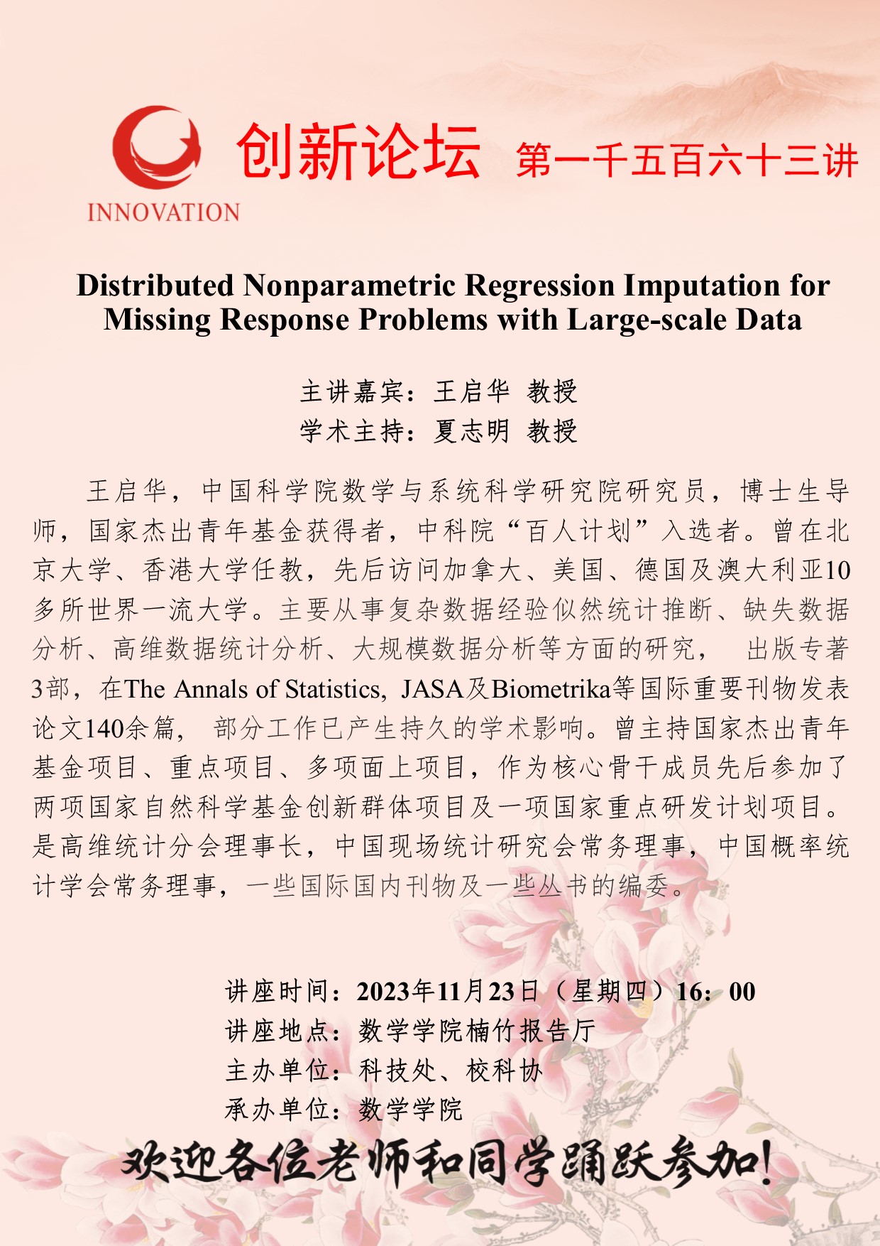 王启华 教授 welcome欢迎光临威尼斯集团创新论坛第一千五百六十三讲:Distributed Nonparametric Regression Imputation for Missing Response Problems with Large-scale Data 讲座时间 2023年11月23日(周四)16:00 讲座地点 数学学院楠竹报告厅 讲座人介绍 王启华 教授 讲座内容
