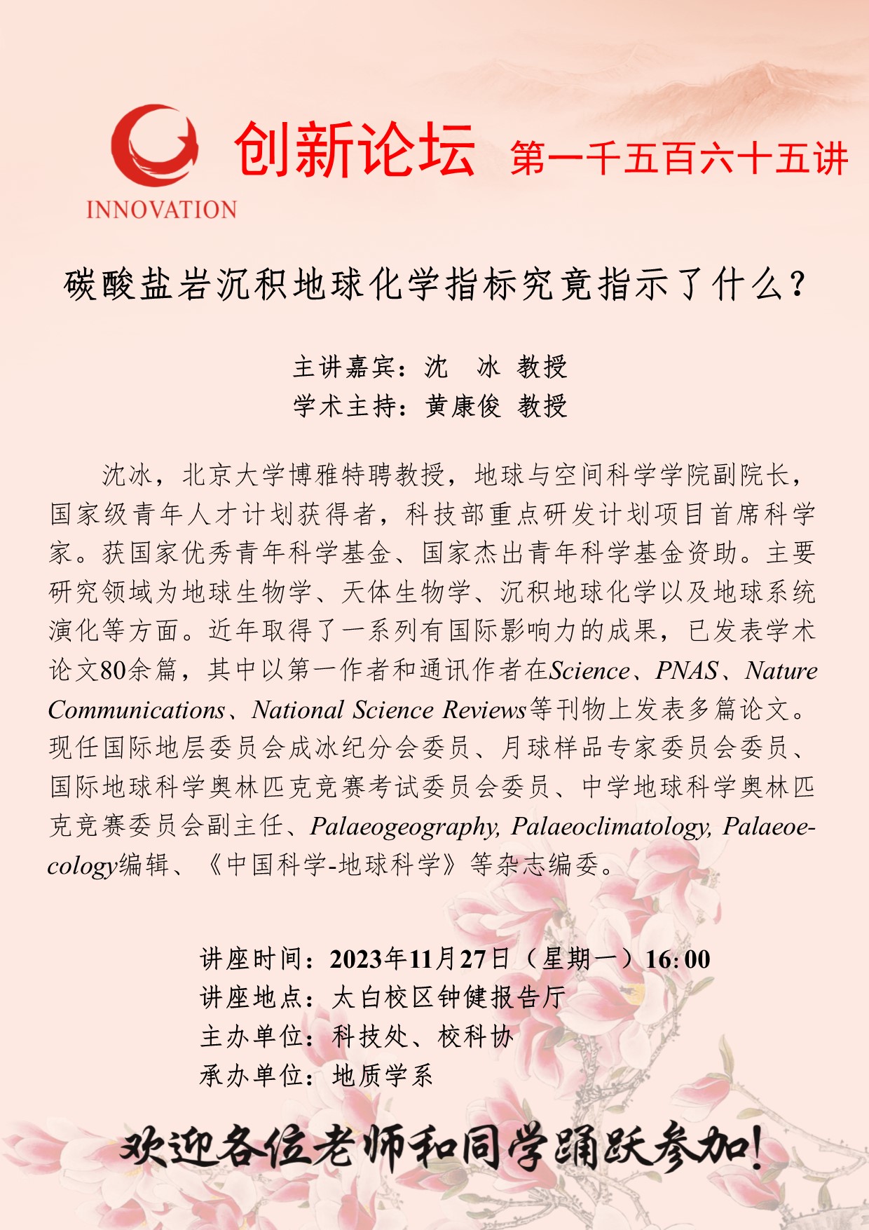 沈冰 教授 welcome欢迎光临威尼斯集团创新论坛第一千五百六十五讲:碳酸盐岩沉积地球化学指标究竟指示了什么? 讲座时间 2023年11月27日(星期一)16:00 讲座地点 太白校区钟健报告厅 讲座人介绍 沈冰 教授 讲座内容