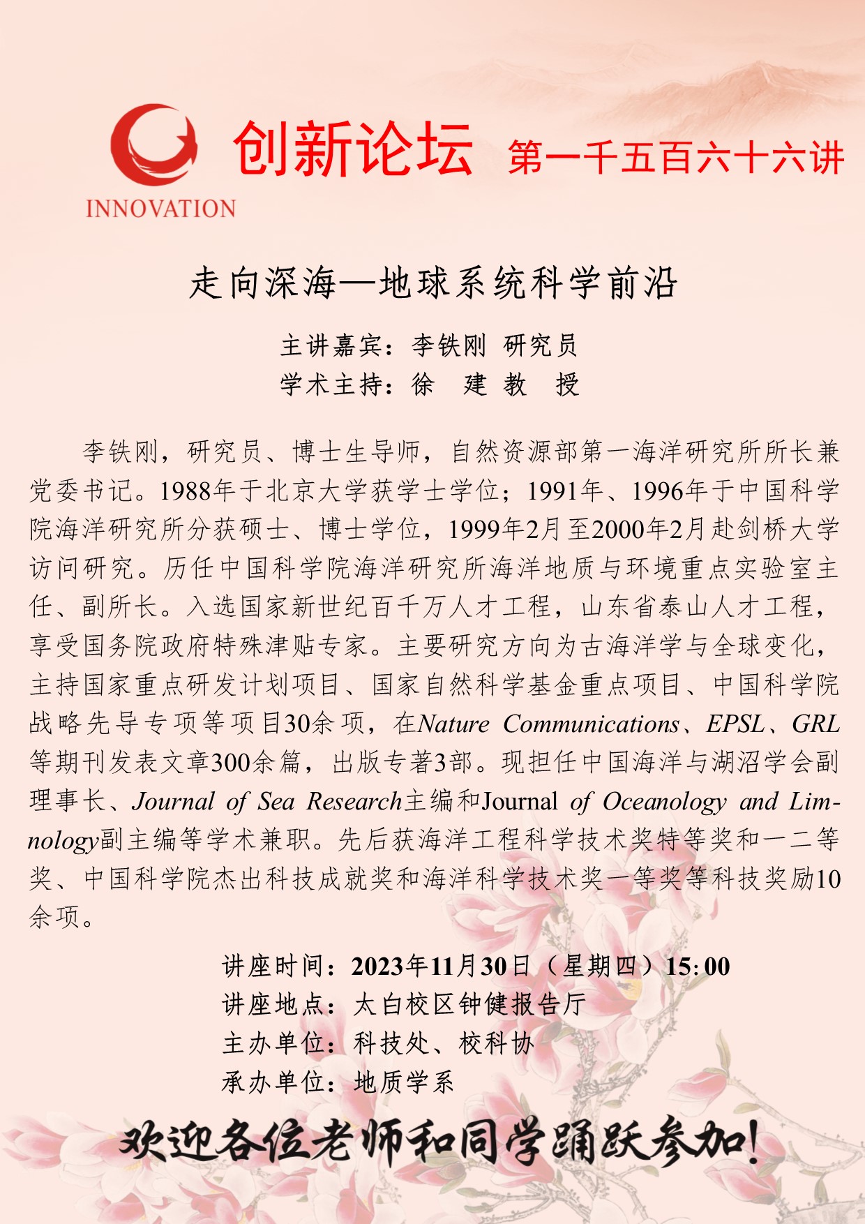 李铁刚 研究员 welcome欢迎光临威尼斯集团创新论坛第一千五百六十六讲:走向深海—地球系统科学前沿 讲座时间 2023年11月30日(星期四)15:00 讲座地点 太白校区钟健报告厅 讲座人介绍 李铁刚 研究员 讲座内容