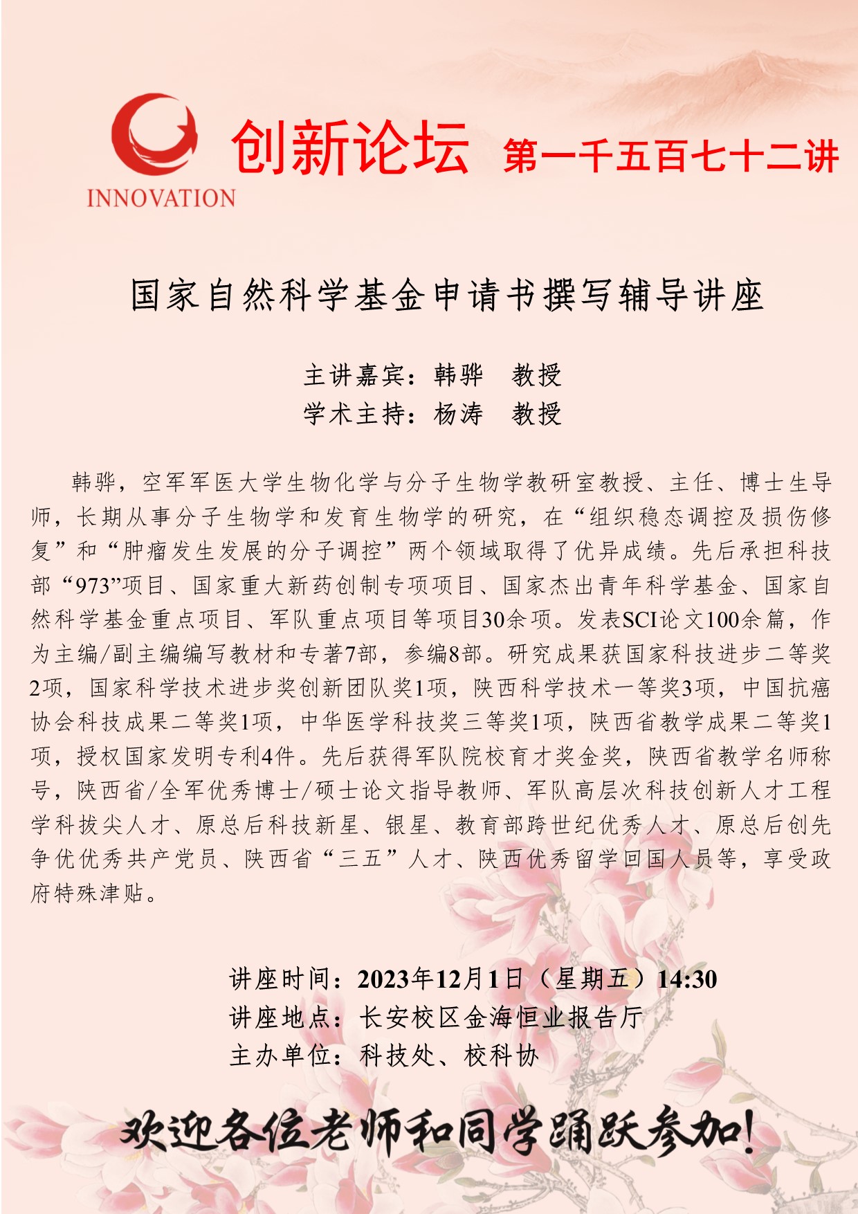 韩骅 教授 welcome欢迎光临威尼斯集团创新论坛第一千五百七十二讲:国家自然科学基金申请书撰写辅导讲座 讲座时间 2023年12月1日(星期五)14:30 讲座地点 长安校区金海恒业报告厅 讲座人介绍 韩骅 教授 讲座内容