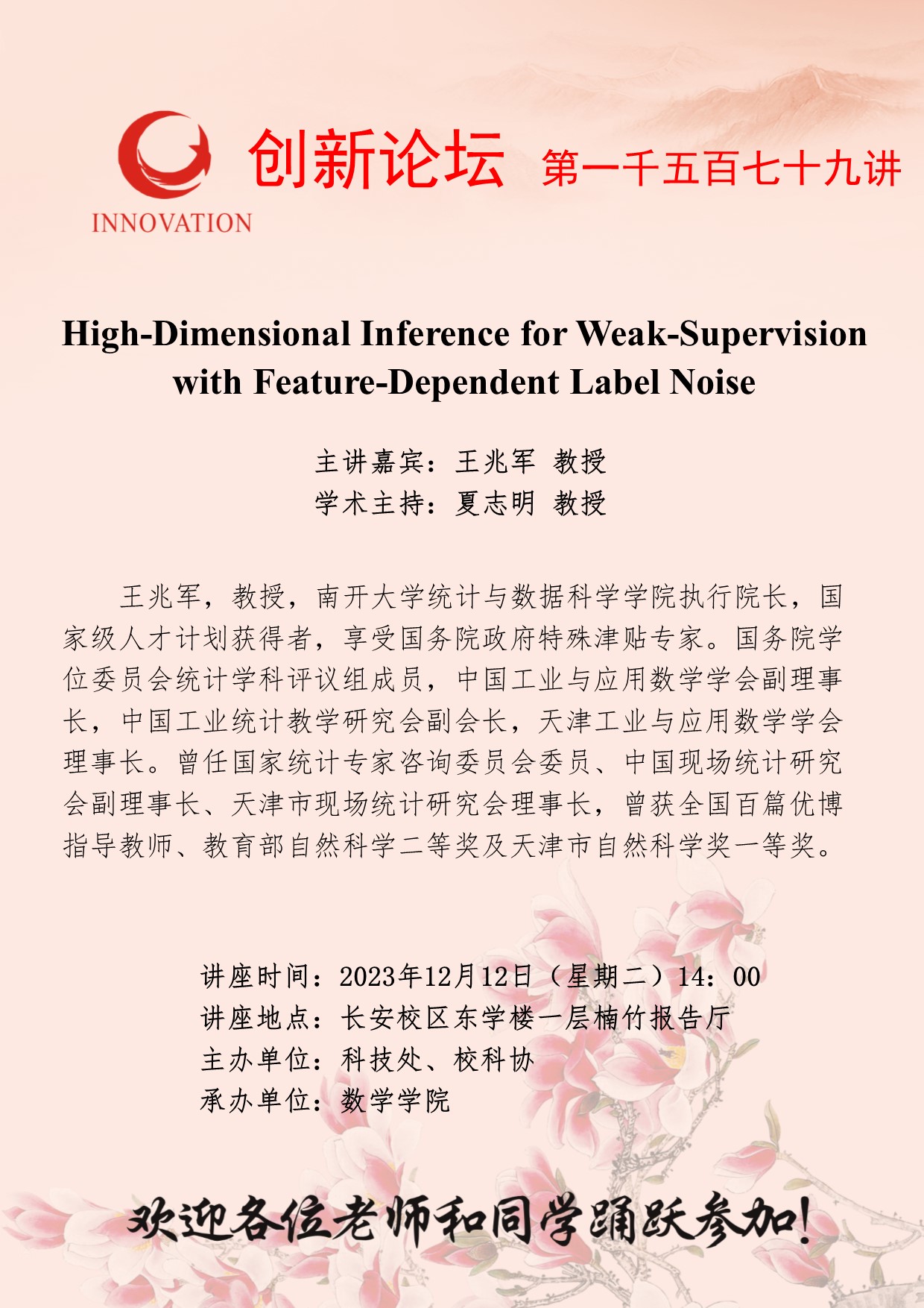 王兆军 教授 welcome欢迎光临威尼斯集团创新论坛第一千五百七十九讲:High-Dimensional Inference for Weak-Supervision with Feature-Dependent Label Noise 讲座时间 2023年12月12日(星期二)14:00 讲座地点 长安校区东学楼一层楠竹报告厅 讲座人介绍 王兆军 教授 讲座内容