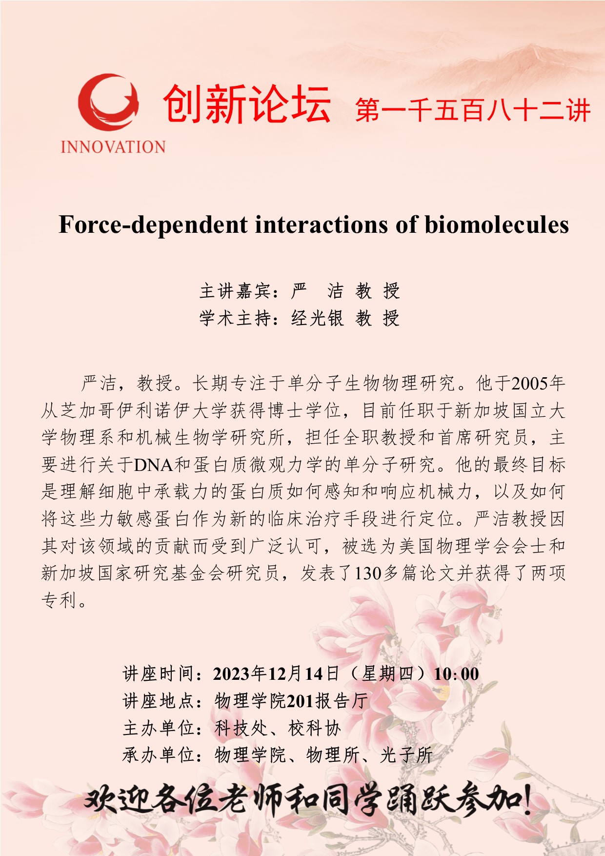 严洁 教授 welcome欢迎光临威尼斯集团创新论坛第一千五百八十二讲:Force-dependent interactions of biomolecules 讲座时间 2023年12月14日(星期四)10:00 讲座地点 物理学院201报告厅 讲座人介绍 严洁 教授 讲座内容
