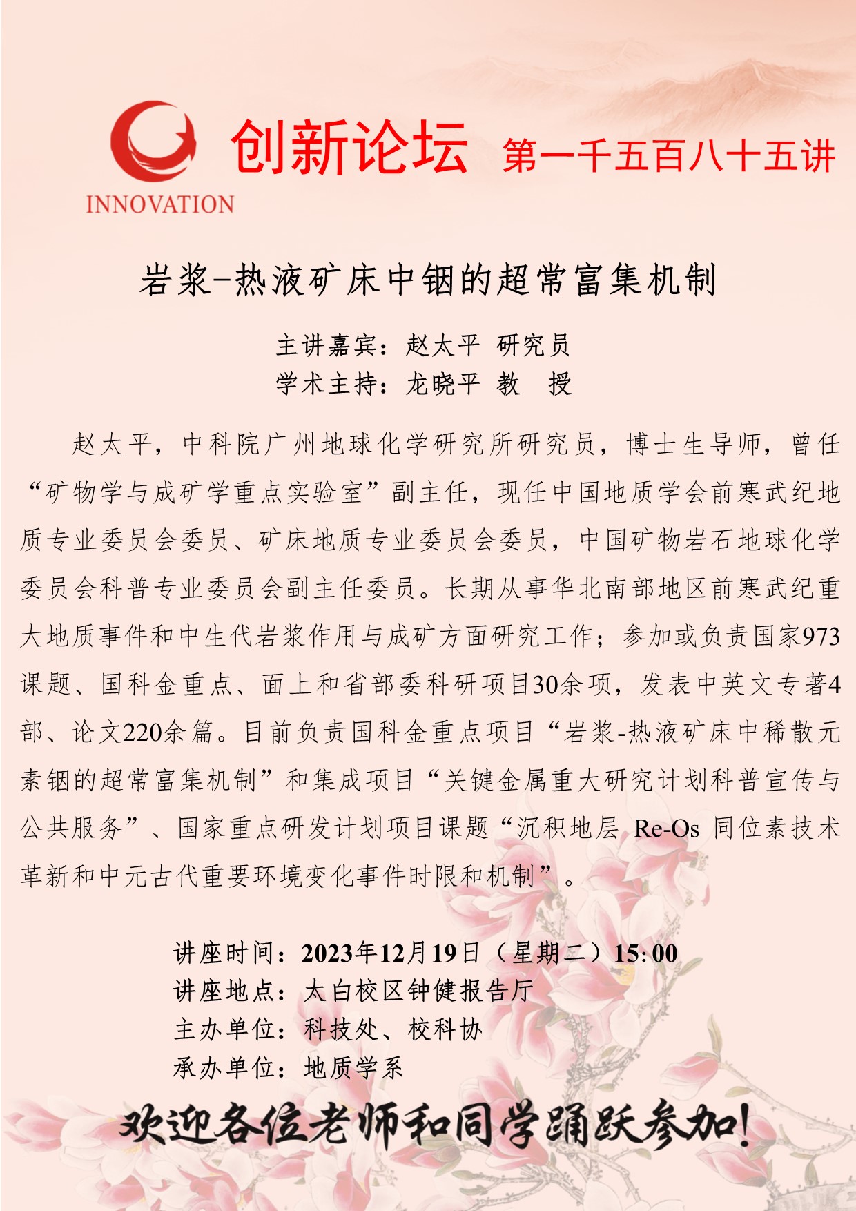赵太平 研究员 welcome欢迎光临威尼斯集团创新论坛第一千五百八十五讲:岩浆-热液矿床中铟的超常富集机制 讲座时间 2023年12月19日(星期二)15:00 讲座地点 太白校区钟健报告厅 讲座人介绍 赵太平 研究员 讲座内容