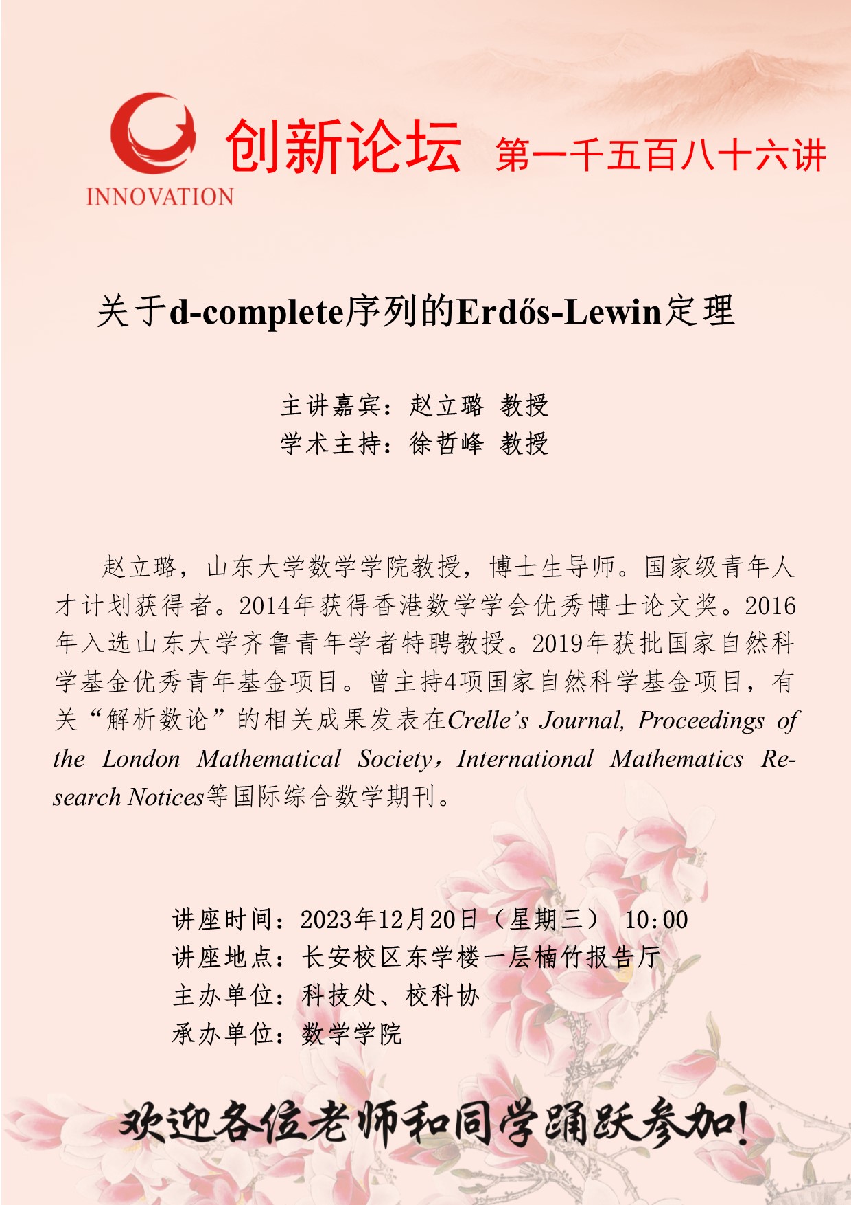 赵立璐 教授 welcome欢迎光临威尼斯集团创新论坛第一千五百八十六讲:关于d-complete序列的Erdős-Lewin定理 讲座时间 2023年12月20日(星期三) 10:00 讲座地点 长安校区东学楼一层楠竹报告厅 讲座人介绍 赵立璐 教授 讲座内容