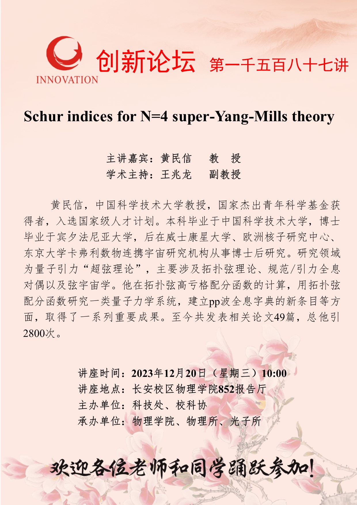 黄民信 教 授 welcome欢迎光临威尼斯集团创新论坛第一千五百八十七讲:Schur indices for N=4 super-Yang-Mills theory 讲座时间 2023年12月20日(星期三)10:00 讲座地点 长安校区物理学院852报告厅 讲座人介绍 黄民信 教 授 讲座内容