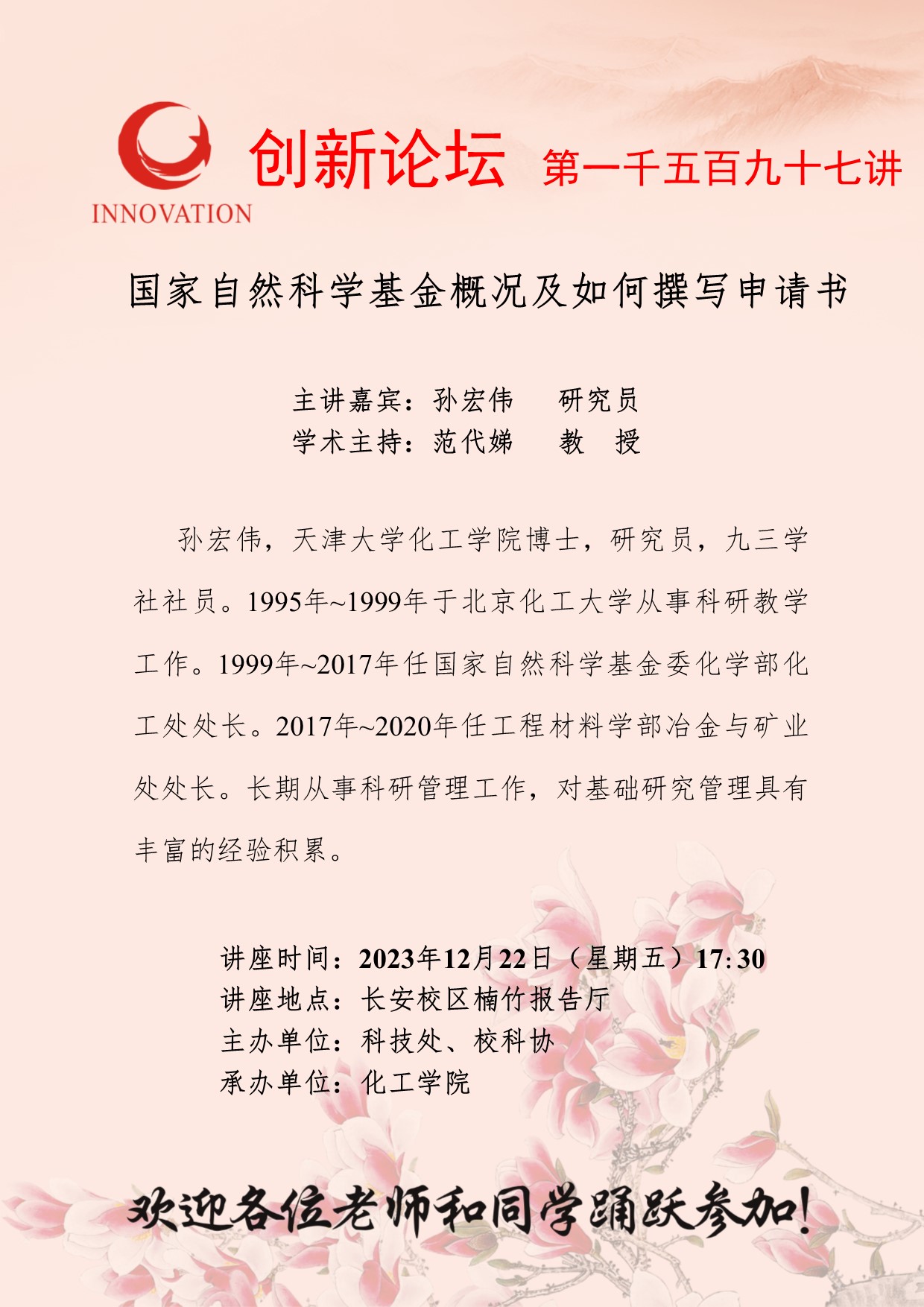 孙宏伟 研究员 welcome欢迎光临威尼斯集团创新论坛第一千五百九十七讲:国家自然科学基金概况及如何撰写申请书 讲座时间 2023年12月22日(星期五)17:30 讲座地点 长安校区楠竹报告厅 讲座人介绍 孙宏伟 研究员 讲座内容