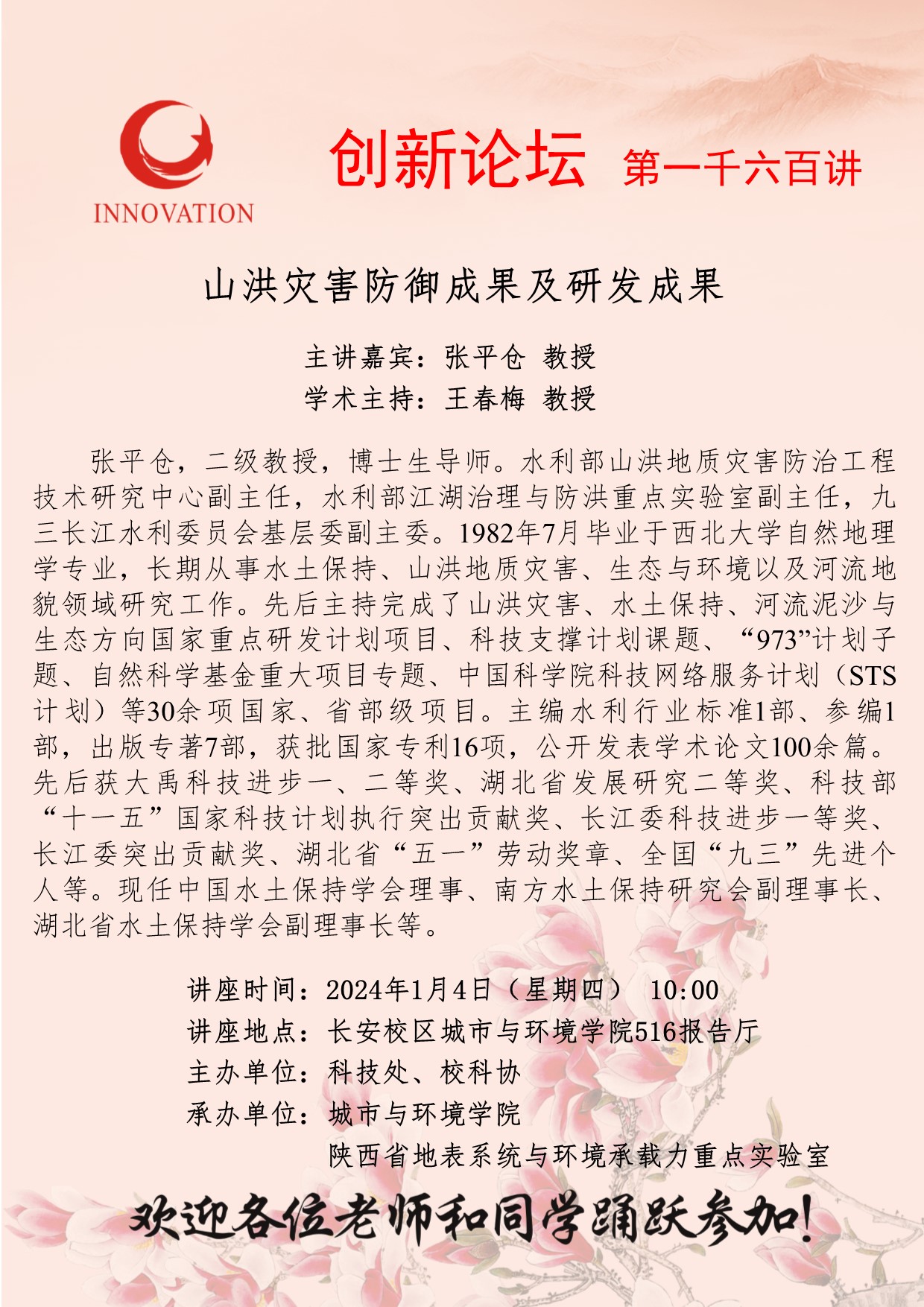 张平仓 教授 welcome欢迎光临威尼斯集团创新论坛第一千六百讲:山洪灾害防御成果及研发成果 讲座时间 2024年1月4日(星期四) 10:00 讲座地点 长安校区城市与环境学院516报告厅 讲座人介绍 张平仓 教授 讲座内容