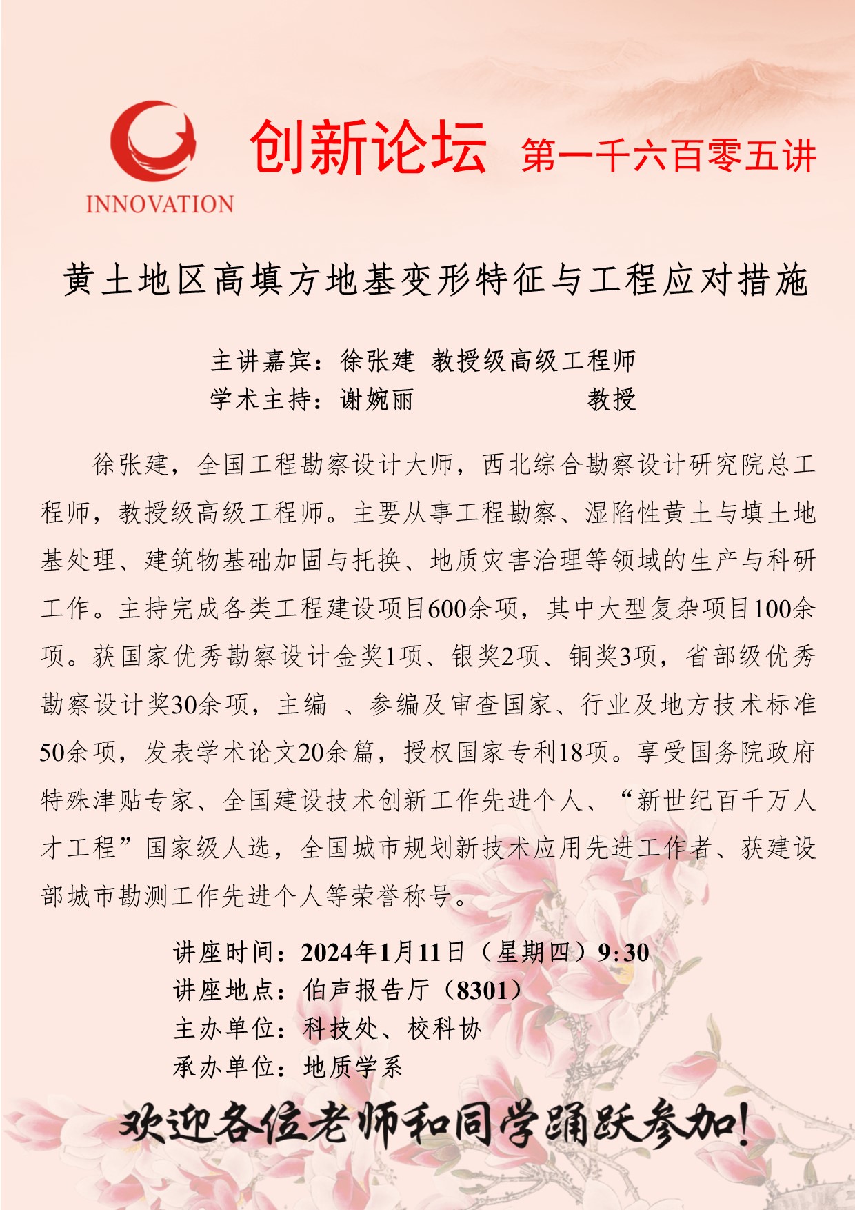 徐张建 教授级高级工程师 welcome欢迎光临威尼斯集团创新论坛第一千六百零五讲:黄土地区高填方地基变形特征与工程应对措施 讲座时间 2024年1月11日(星期四)9:30 讲座地点 伯声报告厅(8301) 讲座人介绍 徐张建 教授级高级工程师 讲座内容