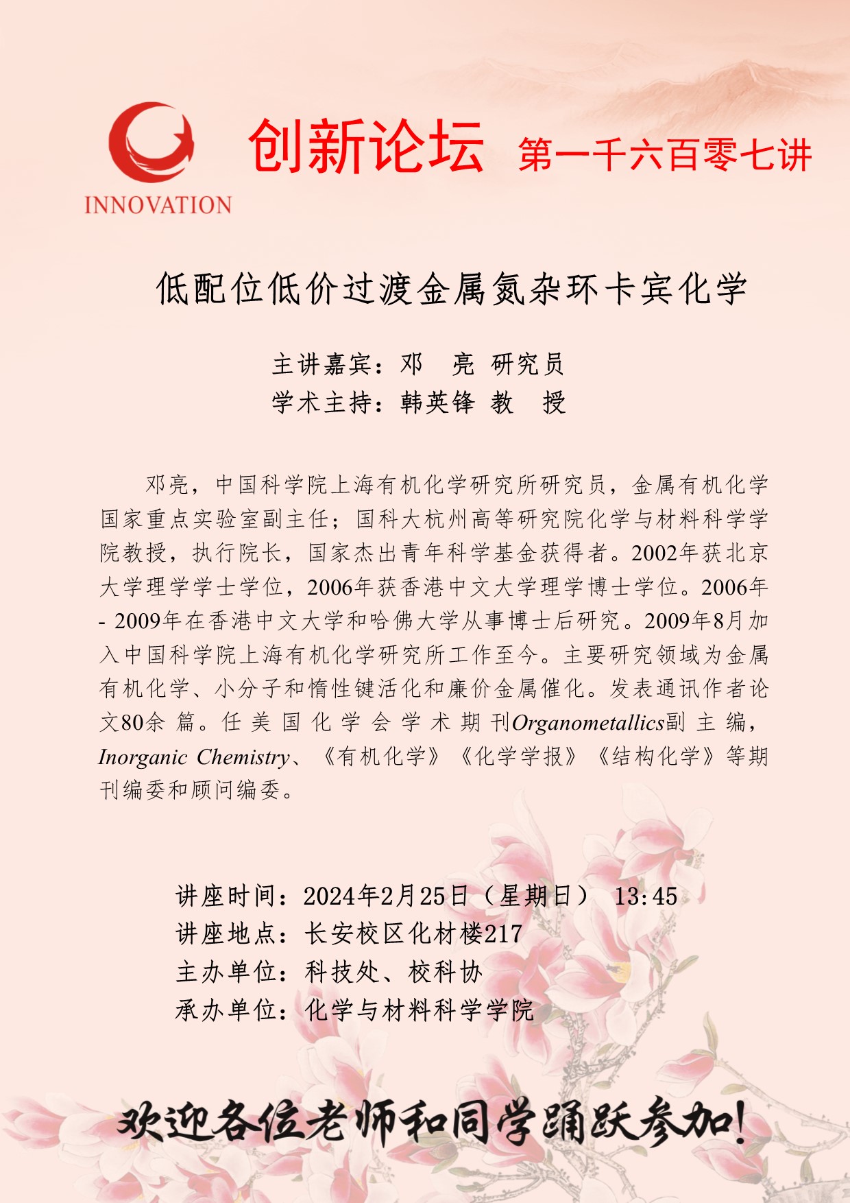 邓亮 研究员 welcome欢迎光临威尼斯集团创新论坛第一千六百零七讲: 低配位低价过渡金属氮杂环卡宾化学 讲座时间 2024年2月25日(星期日) 13:45 讲座地点 长安校区化材楼217 讲座人介绍 邓亮 研究员 讲座内容