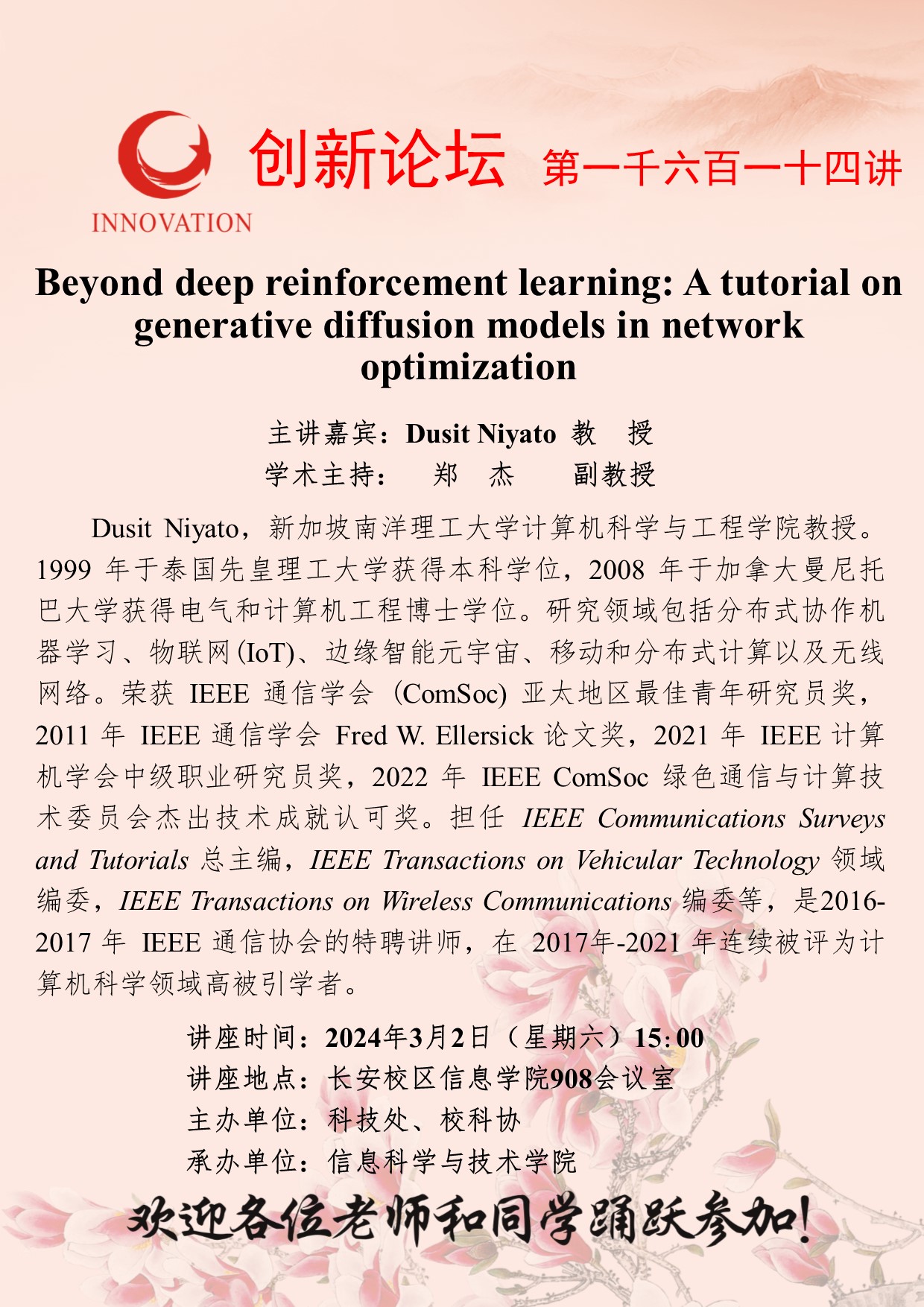 Dusit Niyato 教授 welcome欢迎光临威尼斯集团创新论坛第一千六百一十四讲:Beyond deep reinforcement learning: A tutorial on generative diffusion models in network optimization 讲座时间 2024年3月2日(星期六)15:00 讲座地点 长安校区信息学院908会议室 讲座人介绍 Dusit Niyato 教授 讲座内容