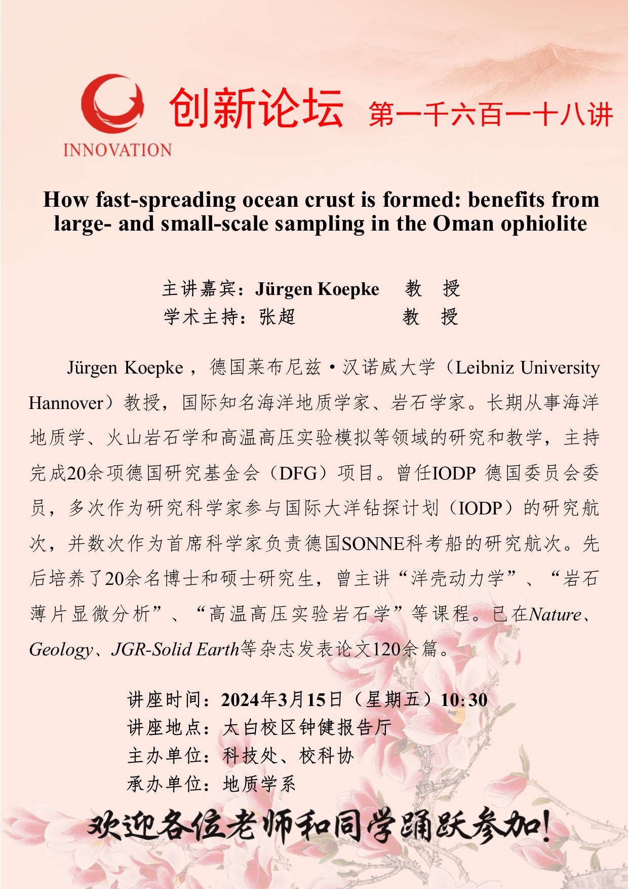Jürgen Koepke 教 授 welcome欢迎光临威尼斯集团创新论坛第一千六百一十八讲:How fast-spreading ocean crust is formed: benefits from large- and small-scale sampling in the Oman ophiolite 讲座时间 2024年3月15日(星期五)10:30 讲座地点 太白校区钟健报告厅 讲座人介绍 Jürgen Koepke 教 授 讲座内容
