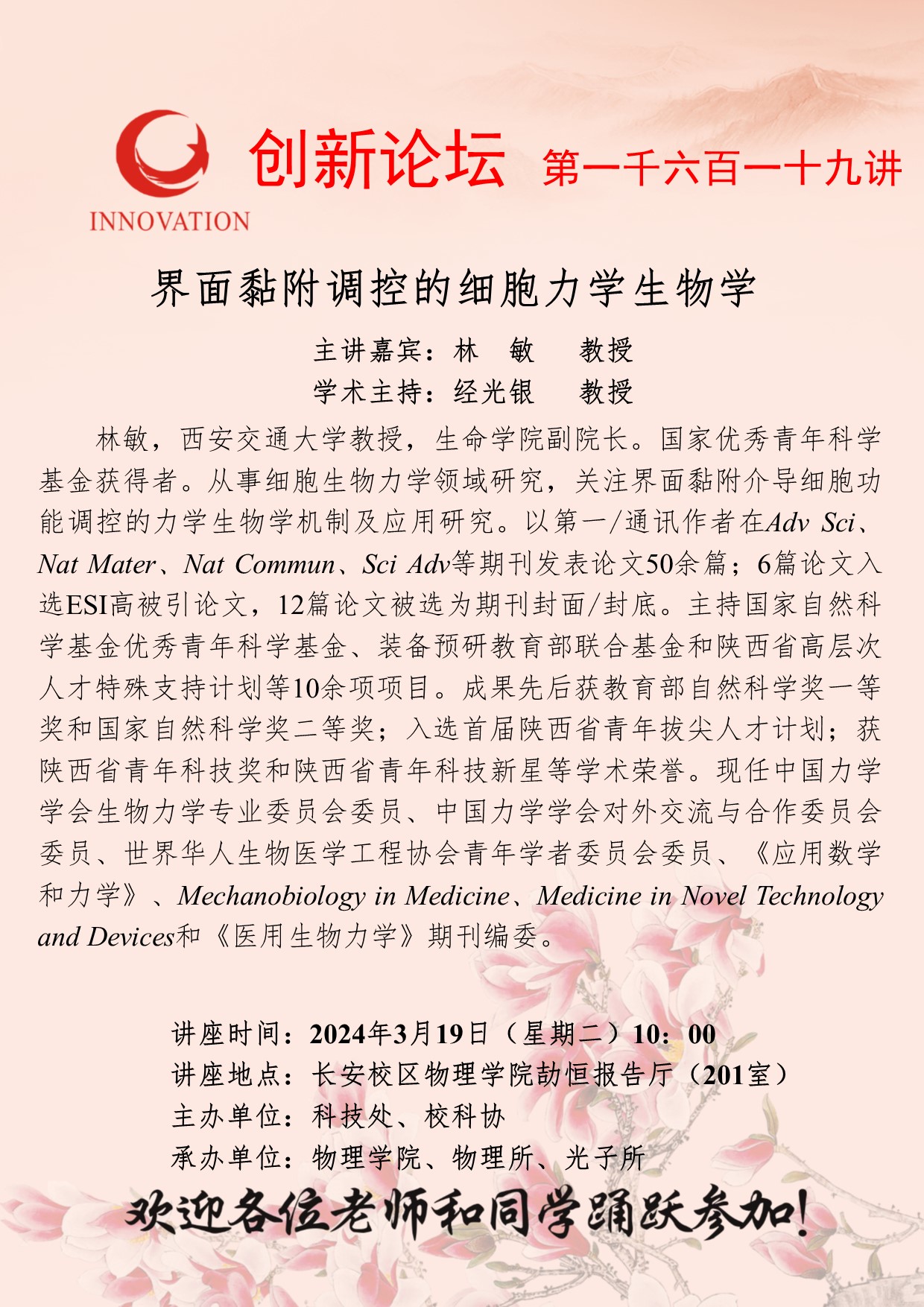 林敏 教授 welcome欢迎光临威尼斯集团创新论坛第一千六百一十九讲:界面黏附调控的细胞力学生物学 讲座时间 2024年3月19日(星期二)10:00 讲座地点 长安校区物理学院劼恒报告厅(201室) 讲座人介绍 林敏 教授 讲座内容