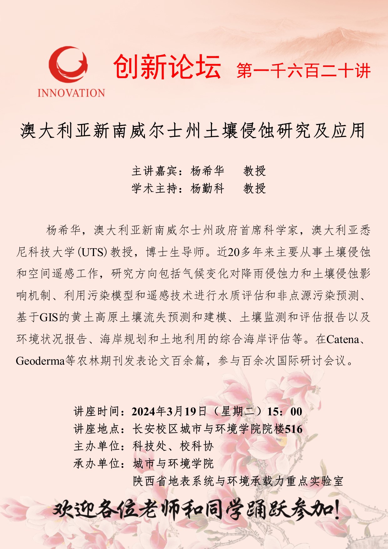 杨希华 教授 welcome欢迎光临威尼斯集团创新论坛第一千六百二十讲:澳大利亚新南威尔士州土壤侵蚀研究及应用 讲座时间 2024年3月19日(星期二)15:00 讲座地点 长安校区城市与环境学院院楼516 讲座人介绍 杨希华 教授 讲座内容