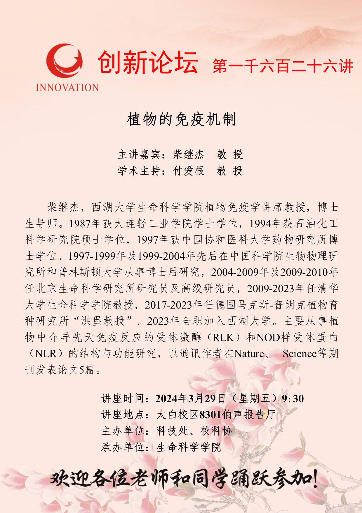 柴继杰 教授 welcome欢迎光临威尼斯集团创新论坛第一千六百二十六讲:植物的免疫机制 讲座时间 2024年3月29日(星期五)09:30 讲座地点 太白校区8301伯声报告厅 讲座人介绍 柴继杰 教授 讲座内容