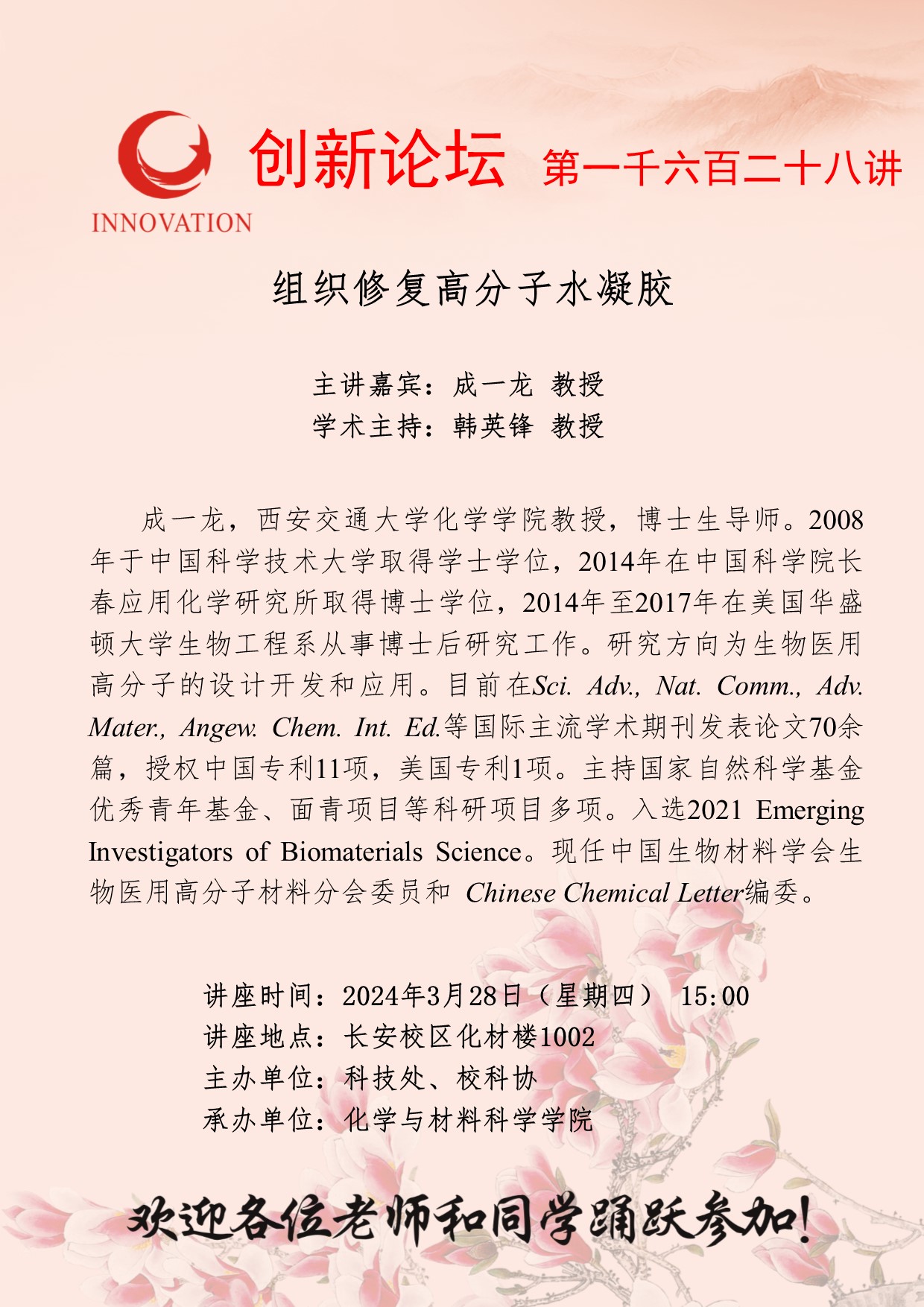 成一龙 教授 welcome欢迎光临威尼斯集团创新论坛第一千六百二十八讲:组织修复高分子水凝胶 讲座时间 2024年3月28日(星期四) 15:00 讲座地点 长安校区化材楼1002 讲座人介绍 成一龙 教授 讲座内容