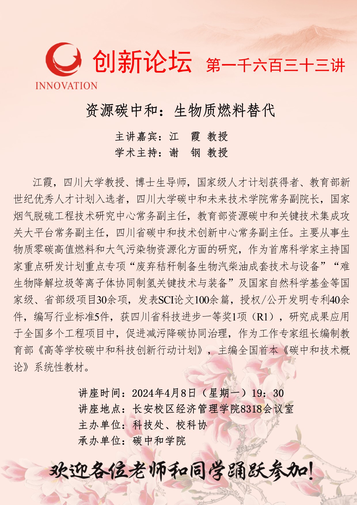 江霞 教授 welcome欢迎光临威尼斯集团创新论坛第一千六百三十三讲:资源碳中和:生物质燃料替代 讲座时间 2024年4月8日(星期一)19:30 讲座地点 长安校区经济管理学院8318会议室 讲座人介绍 江霞 教授 讲座内容