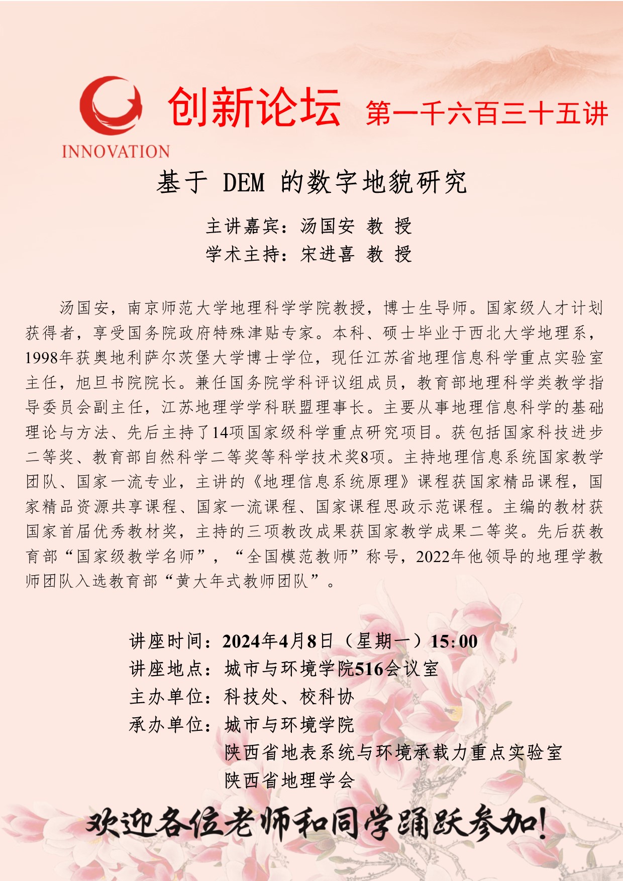 汤国安 教授 welcome欢迎光临威尼斯集团创新论坛第一千六百三十五讲:基于 DEM 的数字地貌研究 讲座时间 2024年4月8日(星期一)15:00 讲座地点 城市与环境学院516会议室 讲座人介绍 汤国安 教授 讲座内容