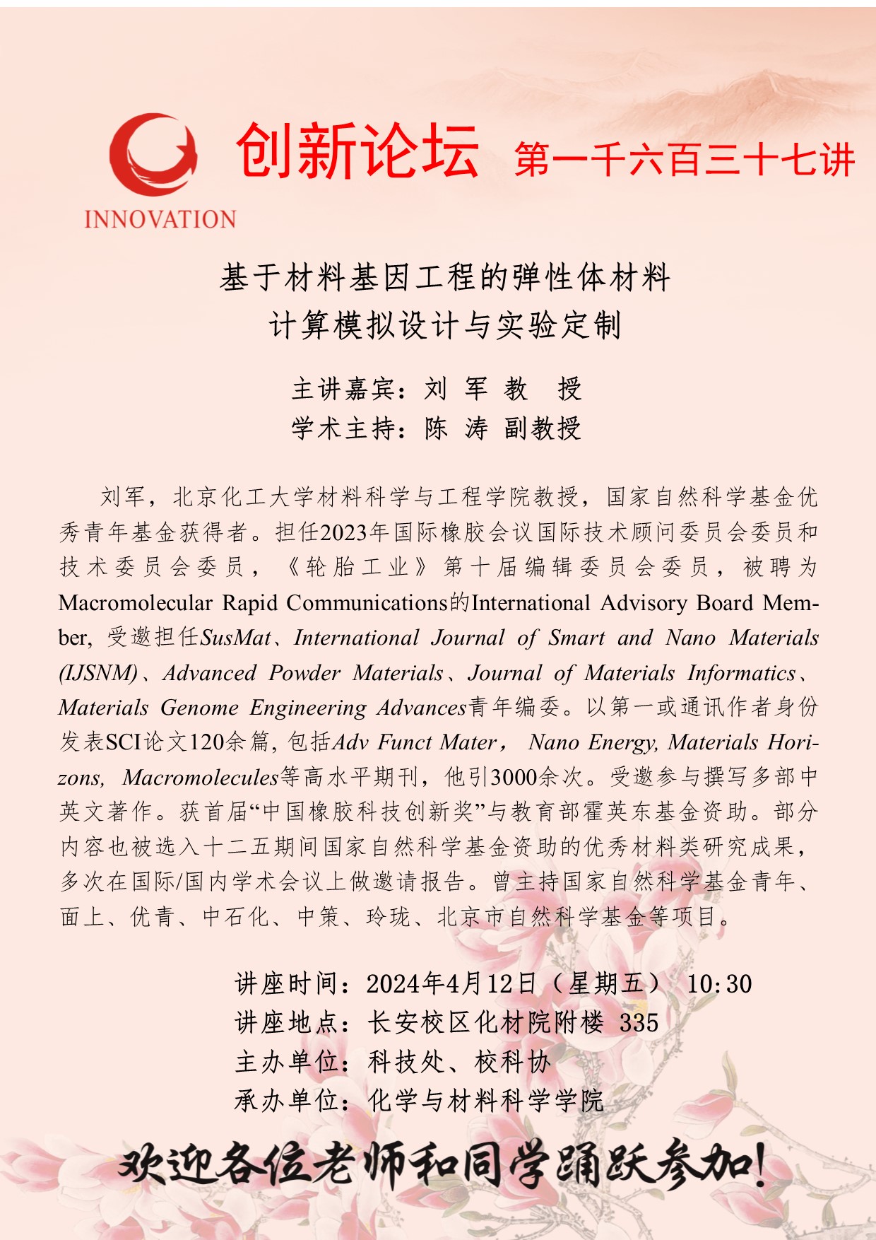 刘军 教授 welcome欢迎光临威尼斯集团创新论坛第一千六百三十七讲:基于材料基因工程的弹性体材料计算模拟设计与实验定制 讲座时间 2024年4月12日(星期五) 10:30 讲座地点 长安校区化材院附楼335 讲座人介绍 刘军 教授 讲座内容