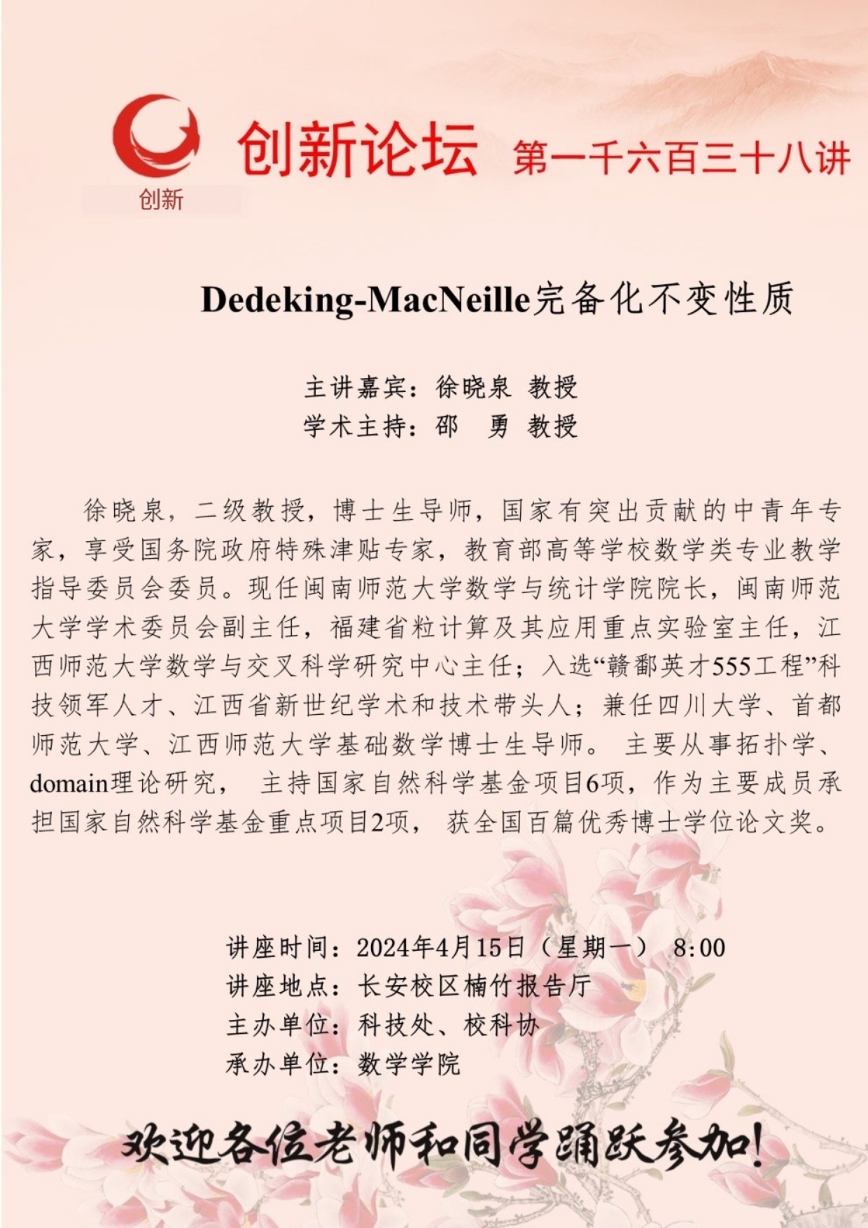 徐晓泉 教授 welcome欢迎光临威尼斯集团创新论坛第一千六百三十八讲:Dedeking-MacNeille完备化不变性质 讲座时间 2024年4月15日(星期一) 8:00 讲座地点 长安校区楠竹报告厅 讲座人介绍 徐晓泉 教授 讲座内容