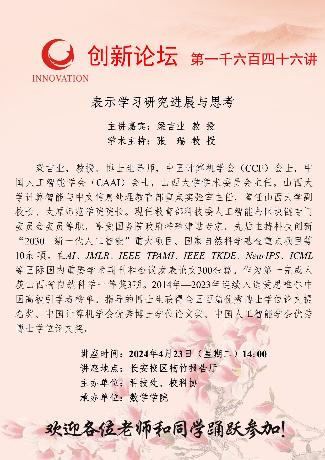 梁吉业 教授 welcome欢迎光临威尼斯集团创新论坛第一千六百四十六讲:表示学习研究进展与思考 讲座时间 2024年4月23日(星期二)14:00 讲座地点 长安校区楠竹报告厅 讲座人介绍 梁吉业 教授 讲座内容