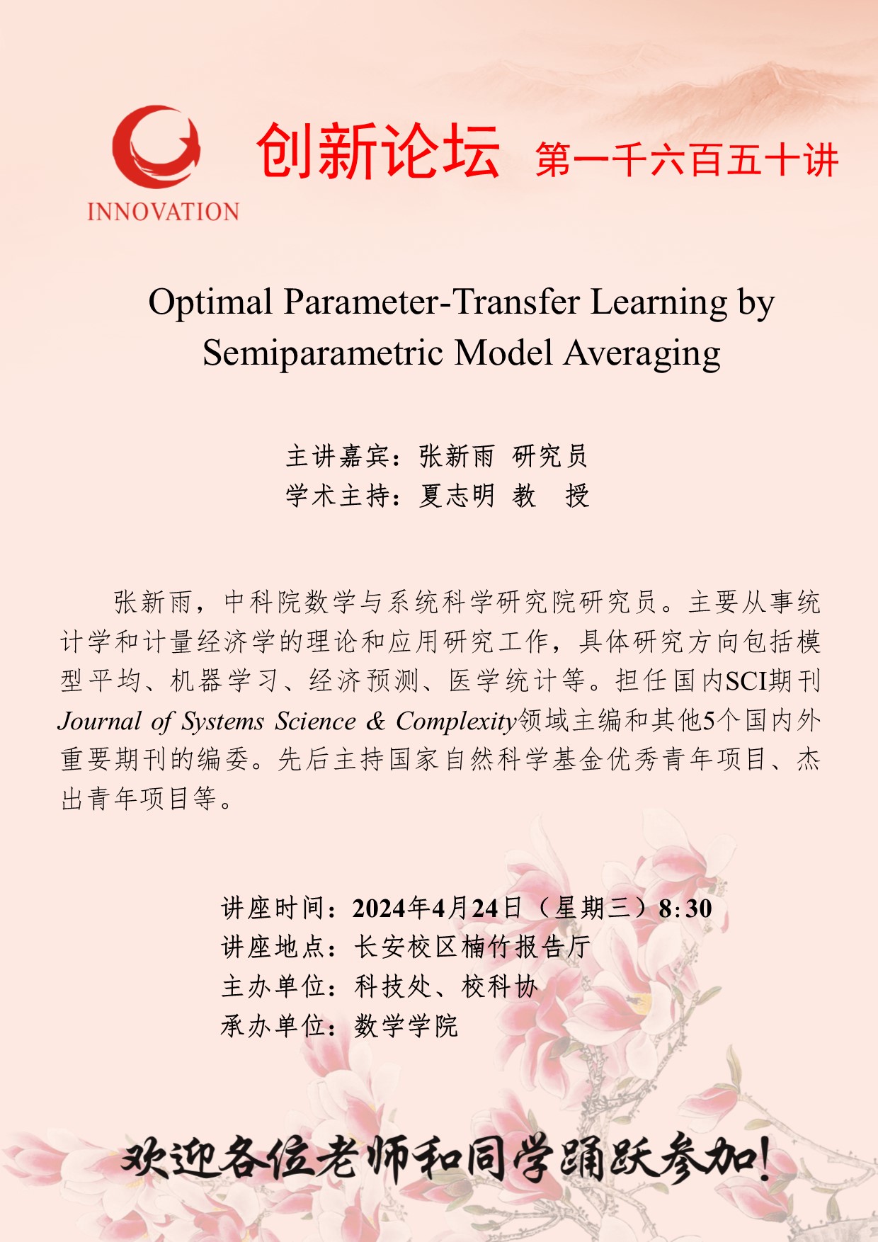 张新雨 研究员 welcome欢迎光临威尼斯集团创新论坛第一千六百五十讲:Optimal Parameter-Transfer Learning by Semiparametric Model Averaging 讲座时间 2024年4月24日(星期三)8:30 讲座地点 长安校区楠竹报告厅 讲座人介绍 张新雨 研究员 讲座内容