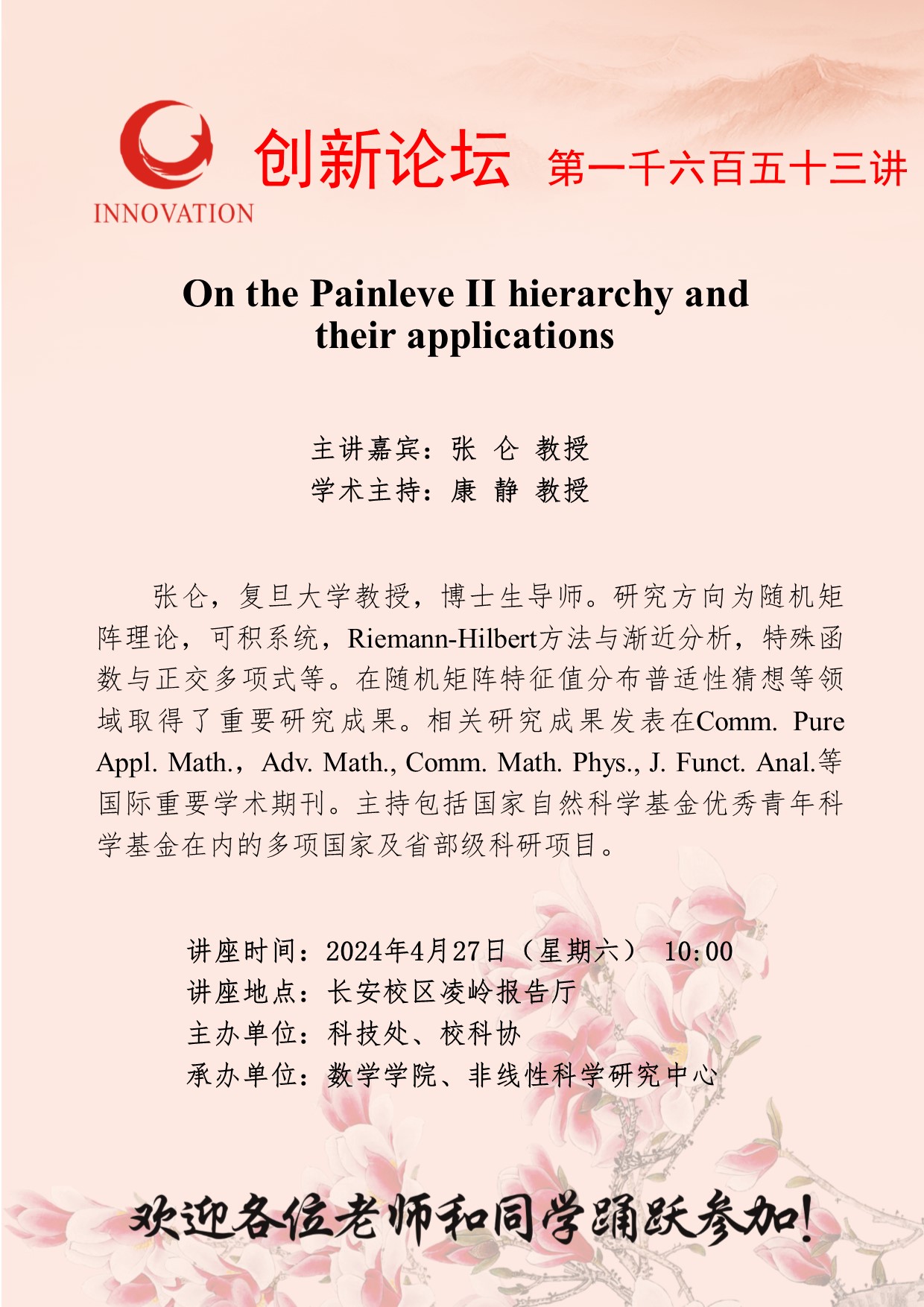 张仑 教授 welcome欢迎光临威尼斯集团创新论坛第一千六百五十三讲:On the Painleve II hierarchy and their applications 讲座时间 2024年4月27日(星期六) 10:00 讲座地点 长安校区凌岭报告厅 讲座人介绍 张仑 教授 讲座内容