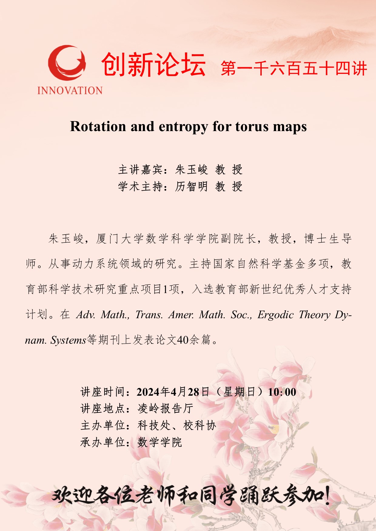 朱玉峻 教授 welcome欢迎光临威尼斯集团创新论坛第一千六百五十四讲:Rotation and entropy for torus maps 讲座时间 2024年4月28日(星期日)10:00 讲座地点 凌岭报告厅 讲座人介绍 朱玉峻 教授 讲座内容