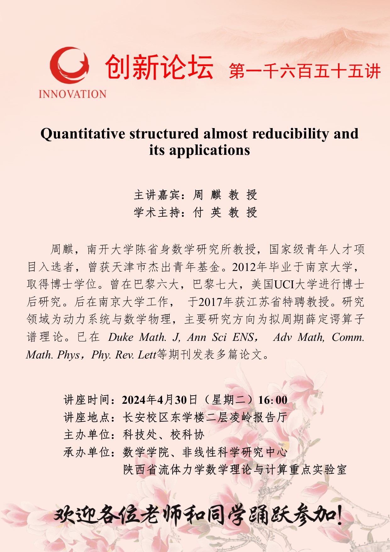 周 麒 教 授 welcome欢迎光临威尼斯集团创新论坛第一千六百五十五讲:Quantitative structured almost reducibility and its applications 讲座时间 2024年4月30日(星期二)16:00 讲座地点 长安校区东学楼二层凌岭报告厅 讲座人介绍 周 麒 教 授 讲座内容