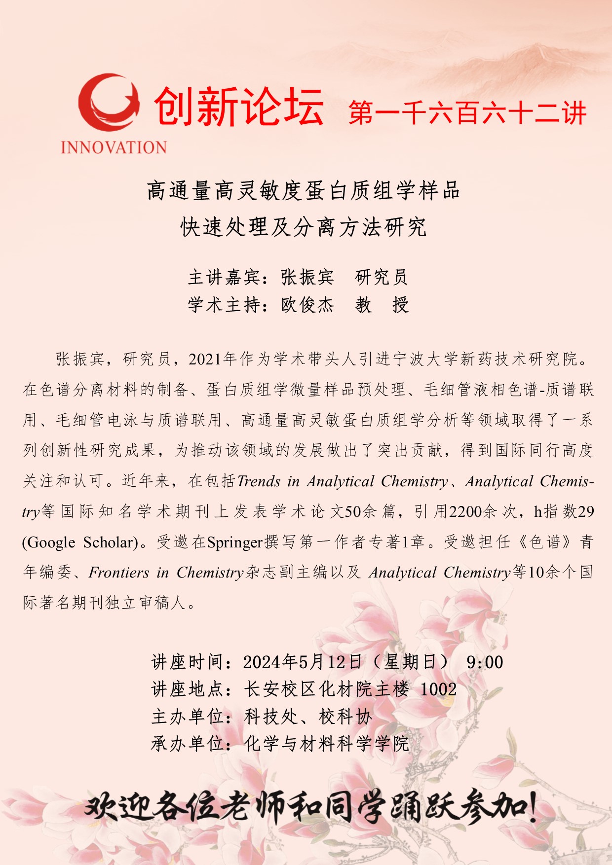 张振宾 研究员 welcome欢迎光临威尼斯集团创新论坛第一千六百六十二讲:高通量高灵敏度蛋白质组学样品快速处理及分离方法研究 讲座时间 2024年5月12日(星期日) 9:00 讲座地点 长安校区化材院主楼 讲座人介绍 张振宾 研究员 讲座内容