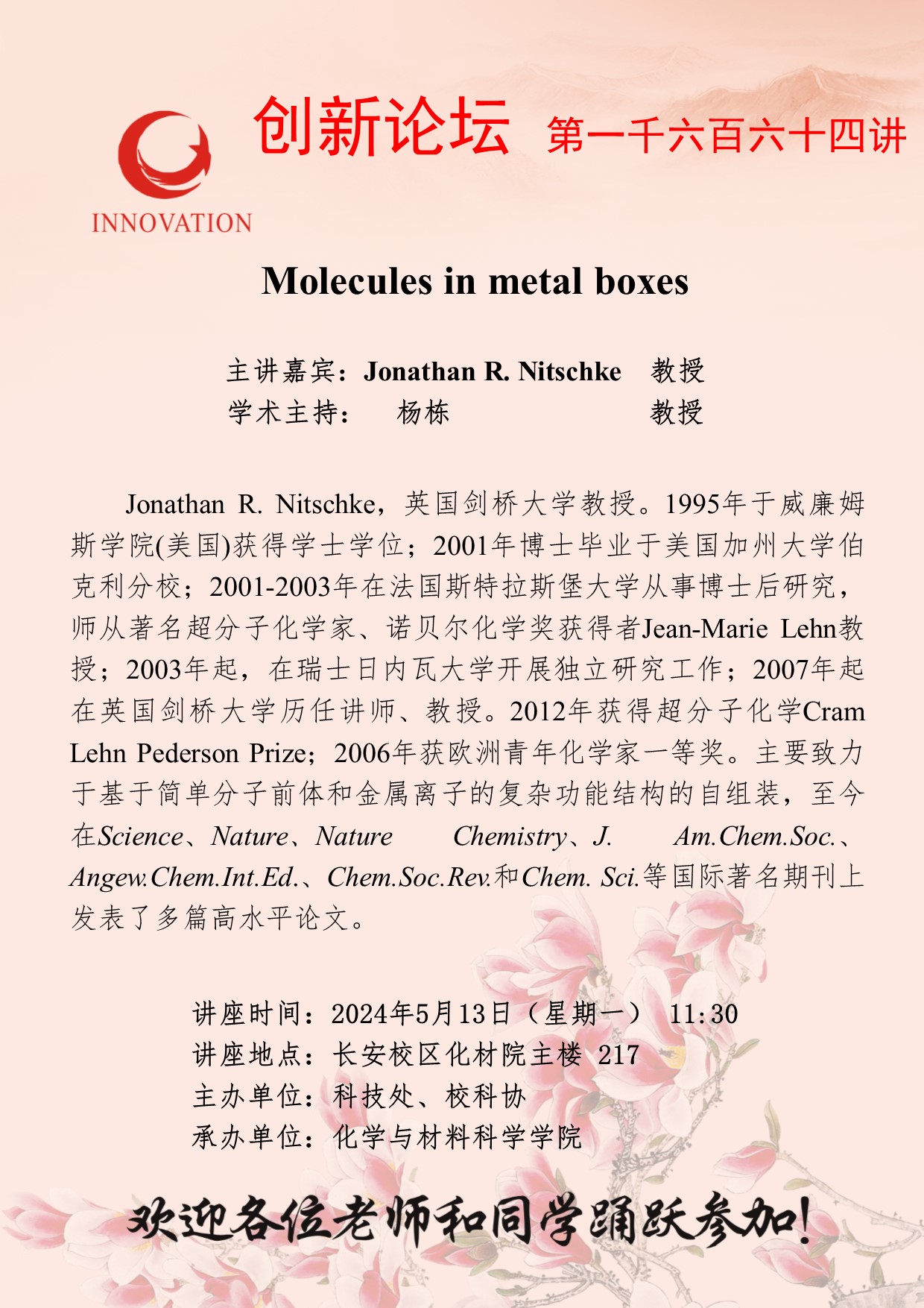 Jonathan R. Nitschke 教授 welcome欢迎光临威尼斯集团创新论坛第一千六百六十四讲:Molecules in metal boxes 讲座时间 2024年5月13日(星期一) 11:30 讲座地点 长安校区化材院主楼 217 讲座人介绍 Jonathan R. Nitschke 教授 讲座内容
