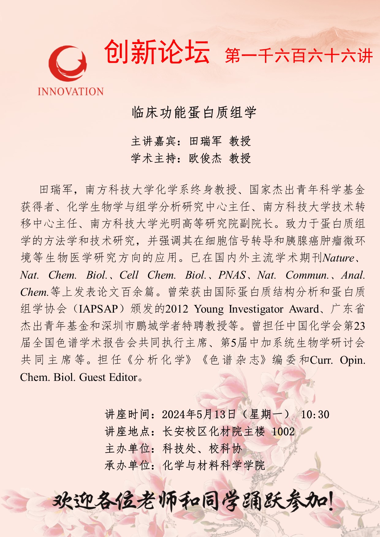 田瑞军 教授 welcome欢迎光临威尼斯集团创新论坛第一千六百六十六讲:临床功能蛋白质组学 讲座时间 2024年5月13日(星期一) 10:30 讲座地点 长安校区化材院主楼 1002 讲座人介绍 田瑞军 教授 讲座内容