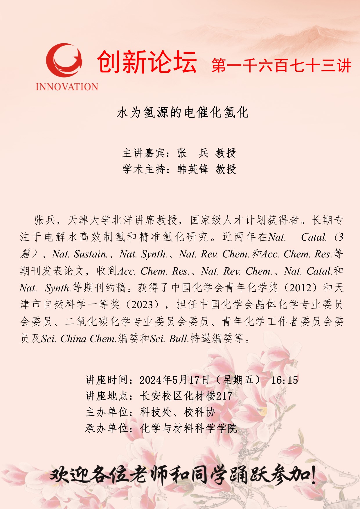 张兵 教授 welcome欢迎光临威尼斯集团创新论坛第一千六百七十三讲:水为氢源的电催化氢化 讲座时间 2024年5月17日(星期五) 16:15 讲座地点 长安校区化材楼217 讲座人介绍 张兵 教授 讲座内容