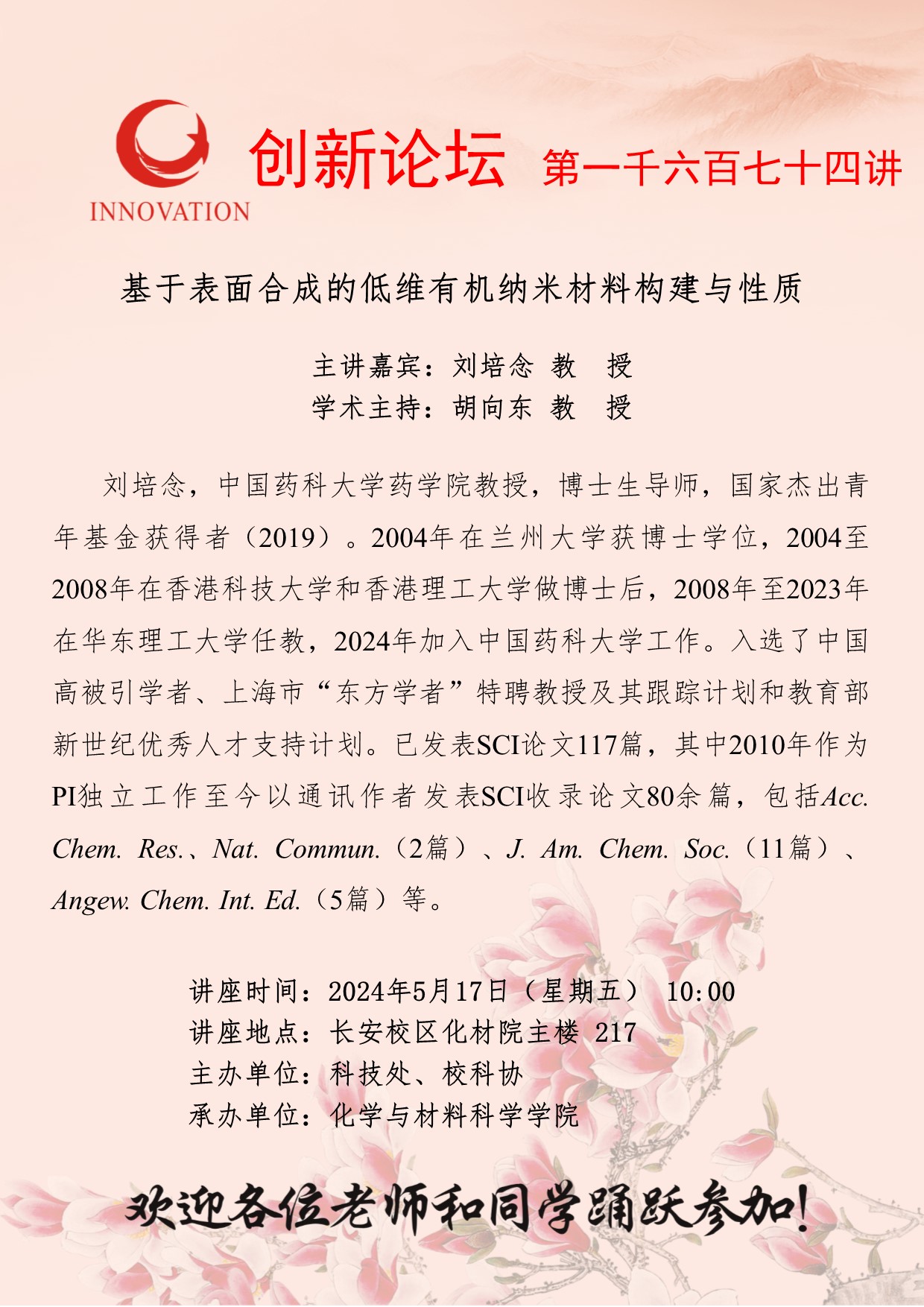 刘培念 教授 welcome欢迎光临威尼斯集团创新论坛第一千六百七十四讲:基于表面合成的低维有机纳米材料构建与性质 讲座时间 2024年5月17日(星期五) 10:00 讲座地点 长安校区化材院主楼 217 讲座人介绍 刘培念 教授 讲座内容