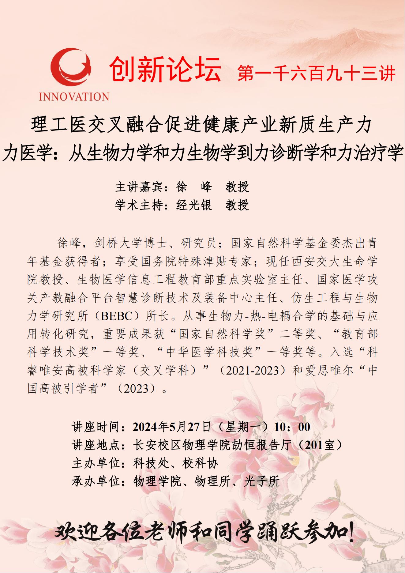 徐峰 教授 welcome欢迎光临威尼斯集团创新论坛第一千六百九十三讲:理工医交叉融合促进健康产业新质生产力——力医学:从生物力学和力生物学到力诊断学和力治疗学 讲座时间 2024年5月27日(星期一)10:00 讲座地点 长安校区物理学院劼恒报告厅(201室) 讲座人介绍 徐峰 教授 讲座内容