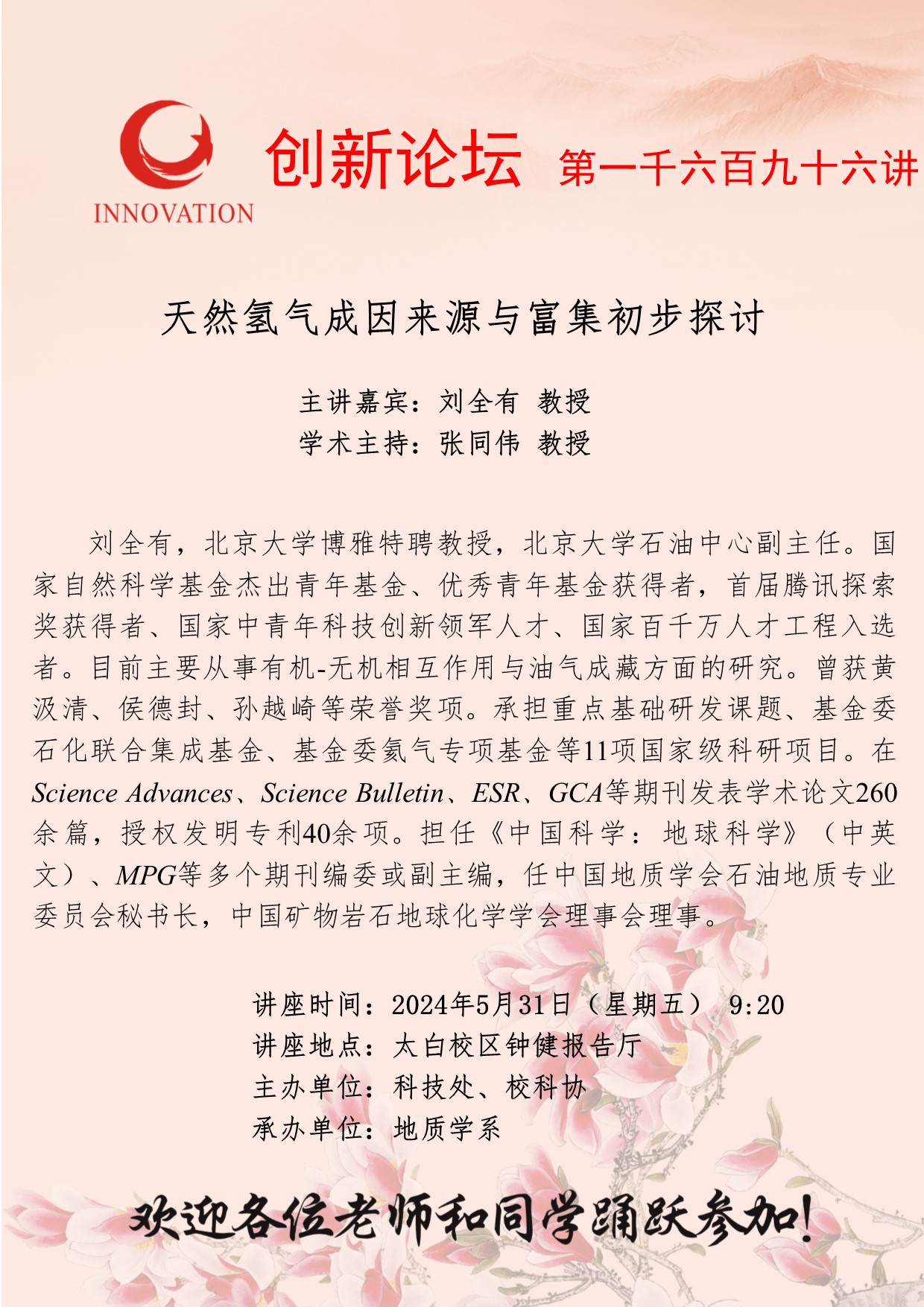 刘全有 教授 welcome欢迎光临威尼斯集团创新论坛第一千六百九十六讲:天然氢气成因来源与富集初步探讨 讲座时间 2024年5月31日(星期五) 9:20 讲座地点 太白校区钟健报告厅 讲座人介绍 刘全有 教授 讲座内容