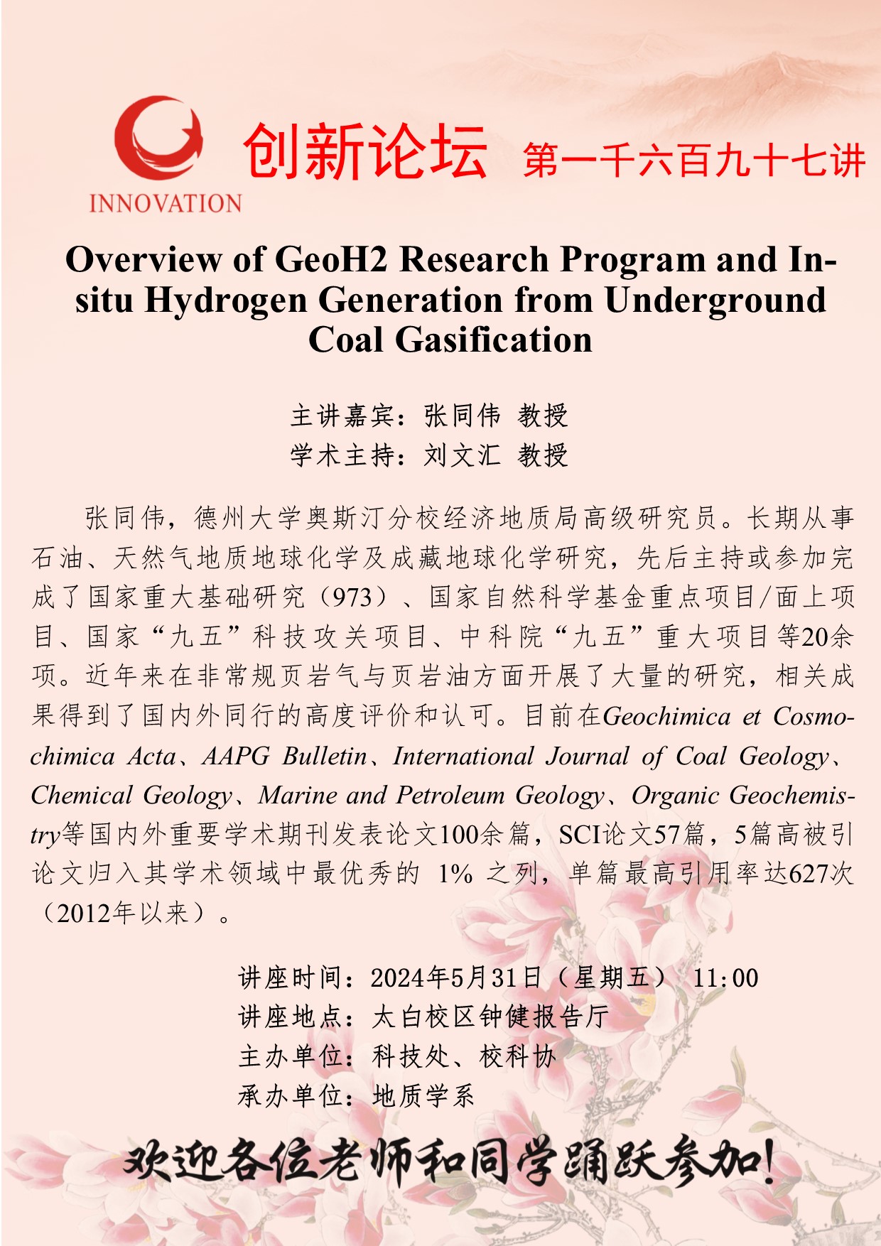张同伟 教授 welcome欢迎光临威尼斯集团创新论坛第一千六百九十七讲:Overview of GeoH2 Research Program and In-situ Hydrogen Generation from Underground Coal Gasification 讲座时间 2024年5月31日(星期五) 11:00 讲座地点 太白校区钟健报告厅 讲座人介绍 张同伟 教授 讲座内容