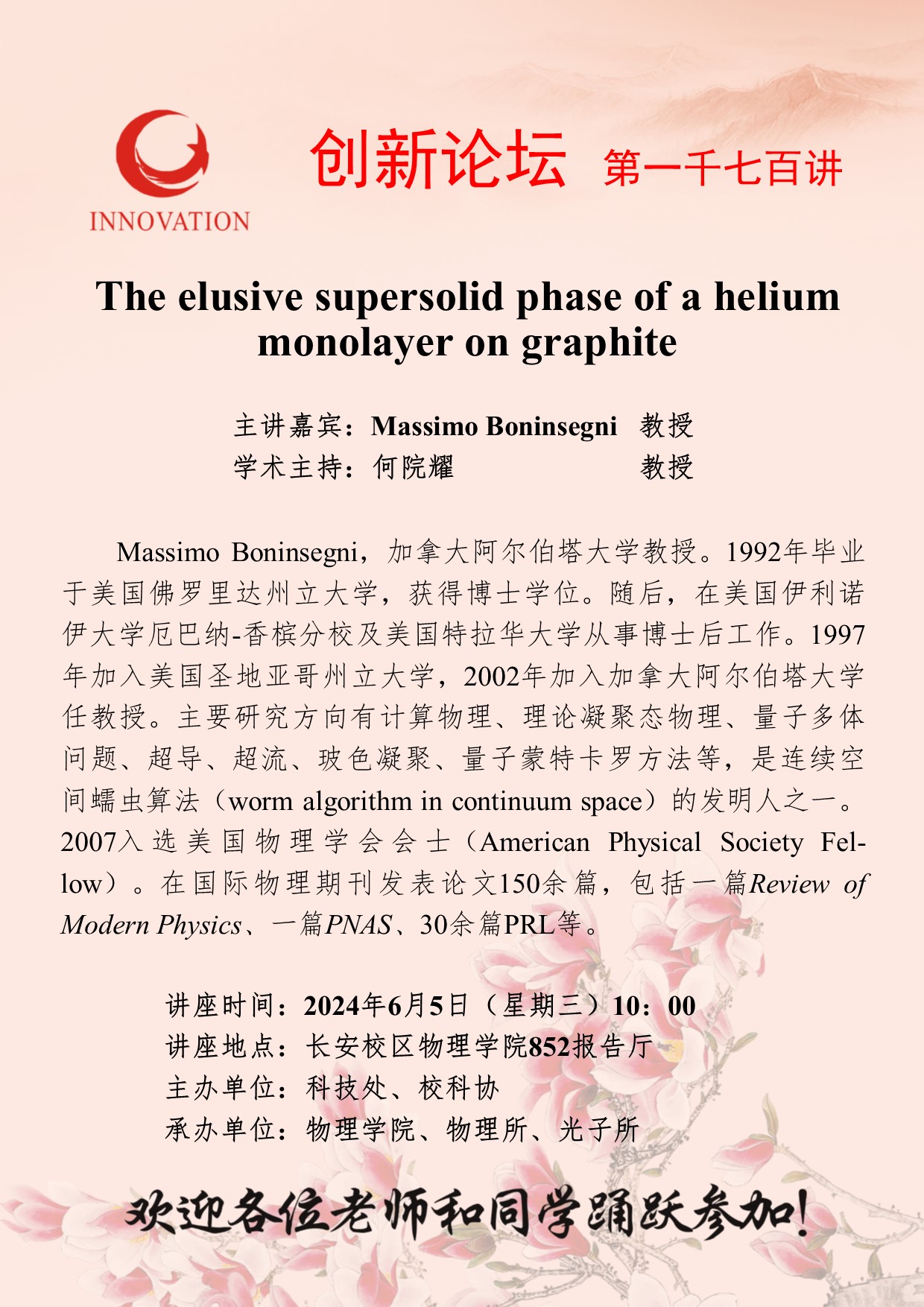 Massimo Boninsegni 教授 welcome欢迎光临威尼斯集团创新论坛第一千七百讲:The elusive supersolid phase of a helium monolayer on graphite 讲座时间 2024年6月5日(星期三)10:00 讲座地点 长安校区物理学院852报告厅 讲座人介绍 Massimo Boninsegni 教授 讲座内容
