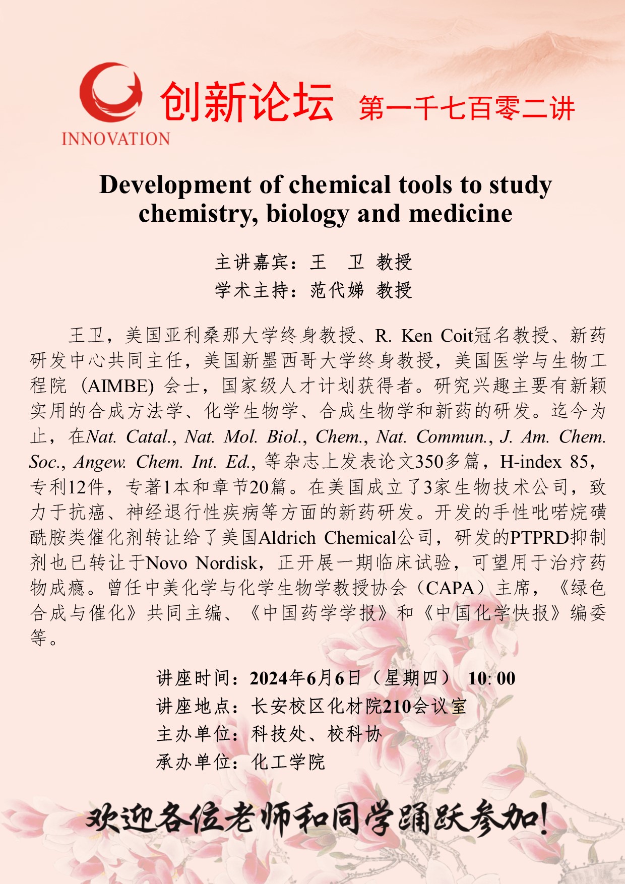 王卫 教授 welcome欢迎光临威尼斯集团创新论坛第一千七百零二讲:Development of chemical tools to study chemistry, biology and medicine 讲座时间 2024年6月6日(星期四) 10: 00 讲座地点 长安校区化材院210会议室 讲座人介绍 王卫 教授 讲座内容