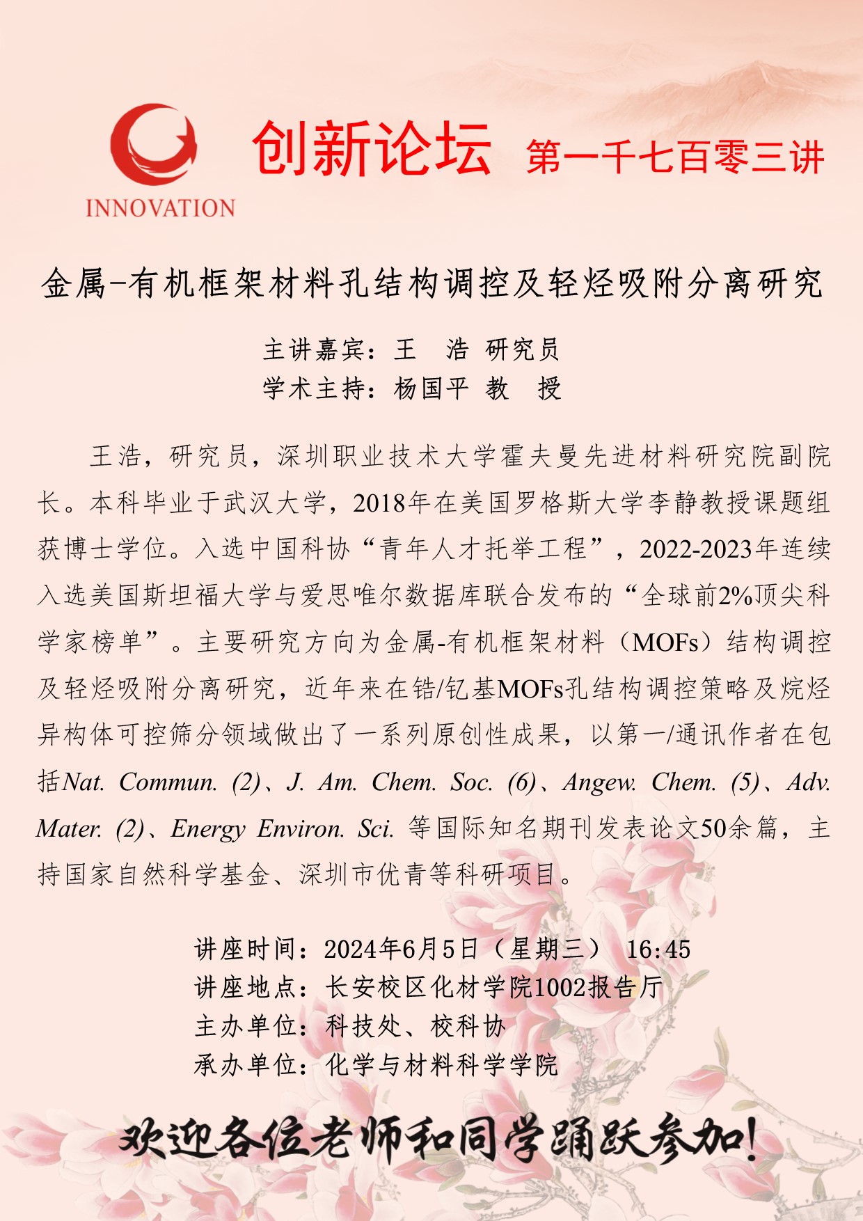 王浩 研究员 welcome欢迎光临威尼斯集团创新论坛第一千七百零三讲:金属-有机框架材料孔结构调控及轻烃吸附分离研究 讲座时间 2024年6月5日(星期三) 16:45 讲座地点 长安校区化材学院1002报告厅 讲座人介绍 王浩 研究员 讲座内容