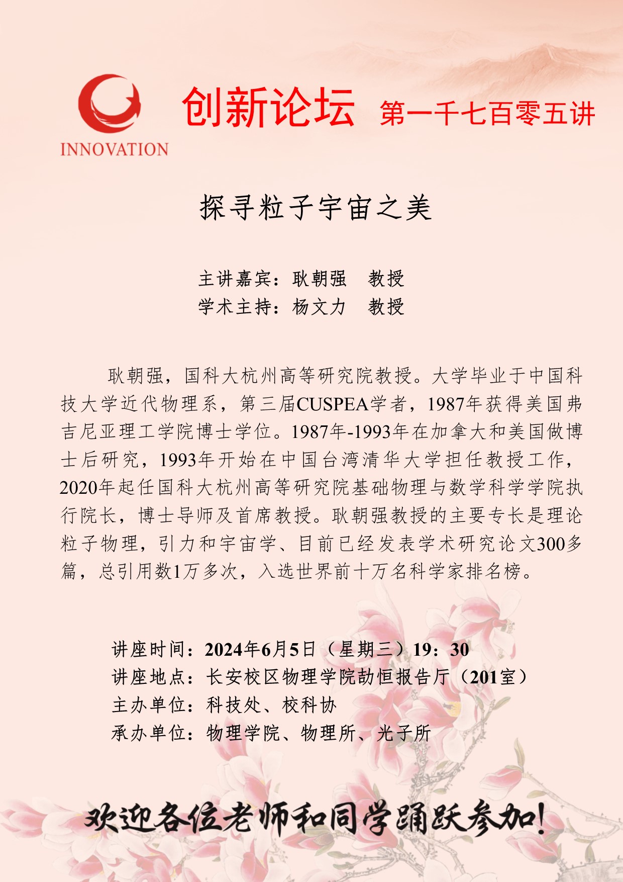 耿朝强 教授 welcome欢迎光临威尼斯集团创新论坛第一千七百零五讲:探寻粒子宇宙之美 讲座时间 2024年6月5日(星期三)19:30 讲座地点 长安校区物理学院劼恒报告厅(201室) 讲座人介绍 耿朝强 教授 讲座内容