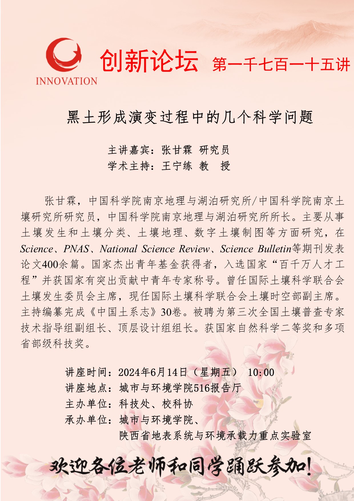 张甘霖 研究员 welcome欢迎光临威尼斯集团创新论坛第一千七百一十五讲:黑土形成演变过程中的几个科学问题 讲座时间 2024年6月14日(星期五) 10:00 讲座地点 城市与环境学院516报告厅 讲座人介绍 张甘霖 研究员 讲座内容