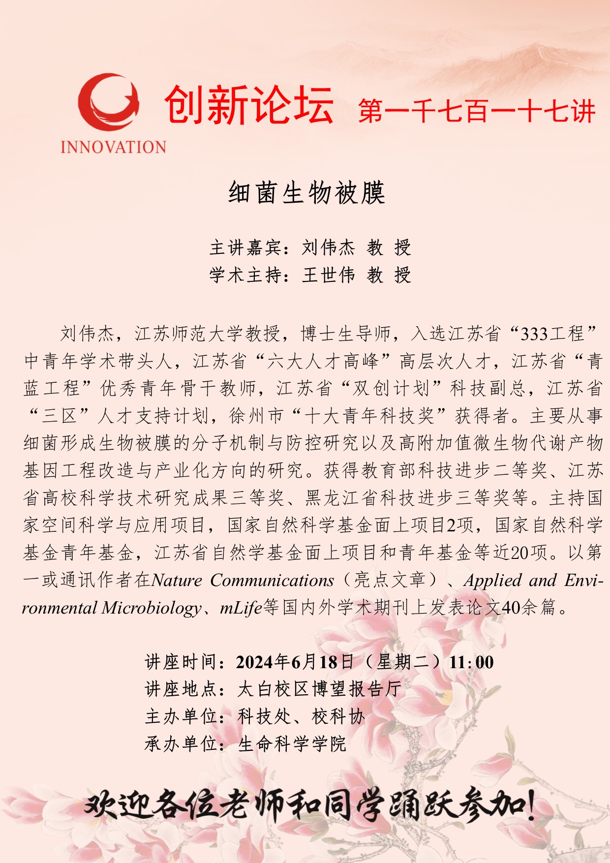 刘伟杰 教授 welcome欢迎光临威尼斯集团创新论坛第一千七百一十七讲:细菌生物被膜 讲座时间 2024年6月18日(星期二)11:00 讲座地点 太白校区博望报告厅 讲座人介绍 刘伟杰 教授 讲座内容