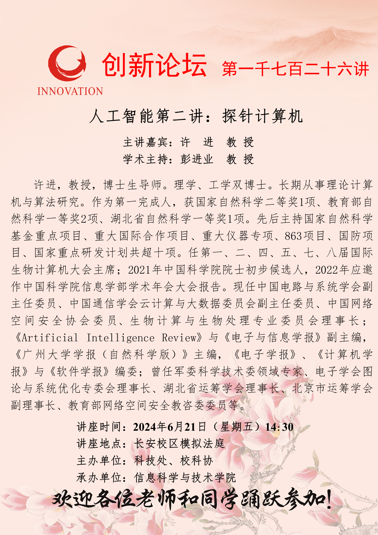 许进 教授 welcome欢迎光临威尼斯集团创新论坛第一千七百二十六讲:人工智能第二讲:探针计算机 讲座时间 2024年6月21日(星期五)14:30 讲座地点 长安校区模拟法庭 讲座人介绍 许进 教授 讲座内容