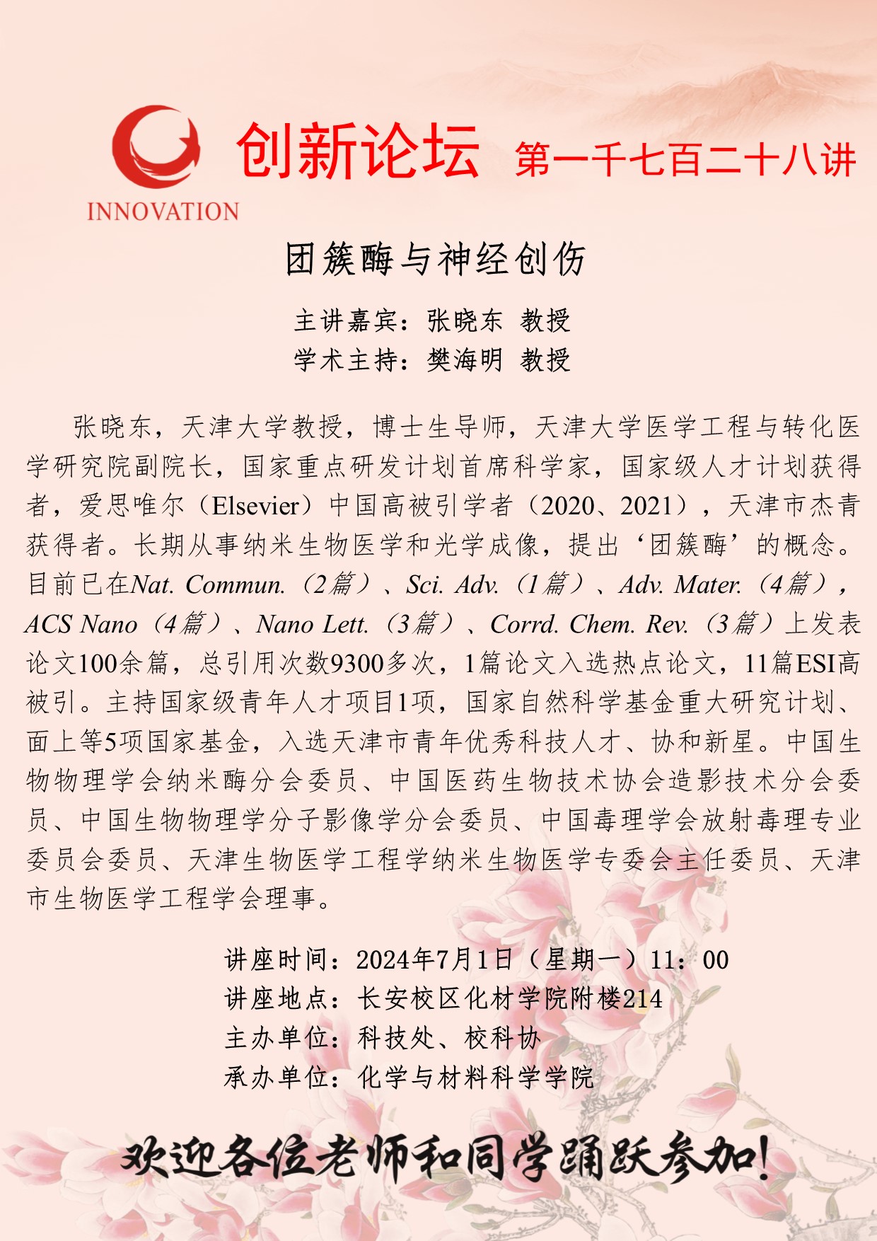 张晓东 教授 welcome欢迎光临威尼斯集团创新论坛第一千七百二十八讲:团簇酶与神经创伤 讲座时间 2024年7月1日(星期一)11:00 讲座地点 长安校区化材学院附楼214 讲座人介绍 张晓东 教授 讲座内容