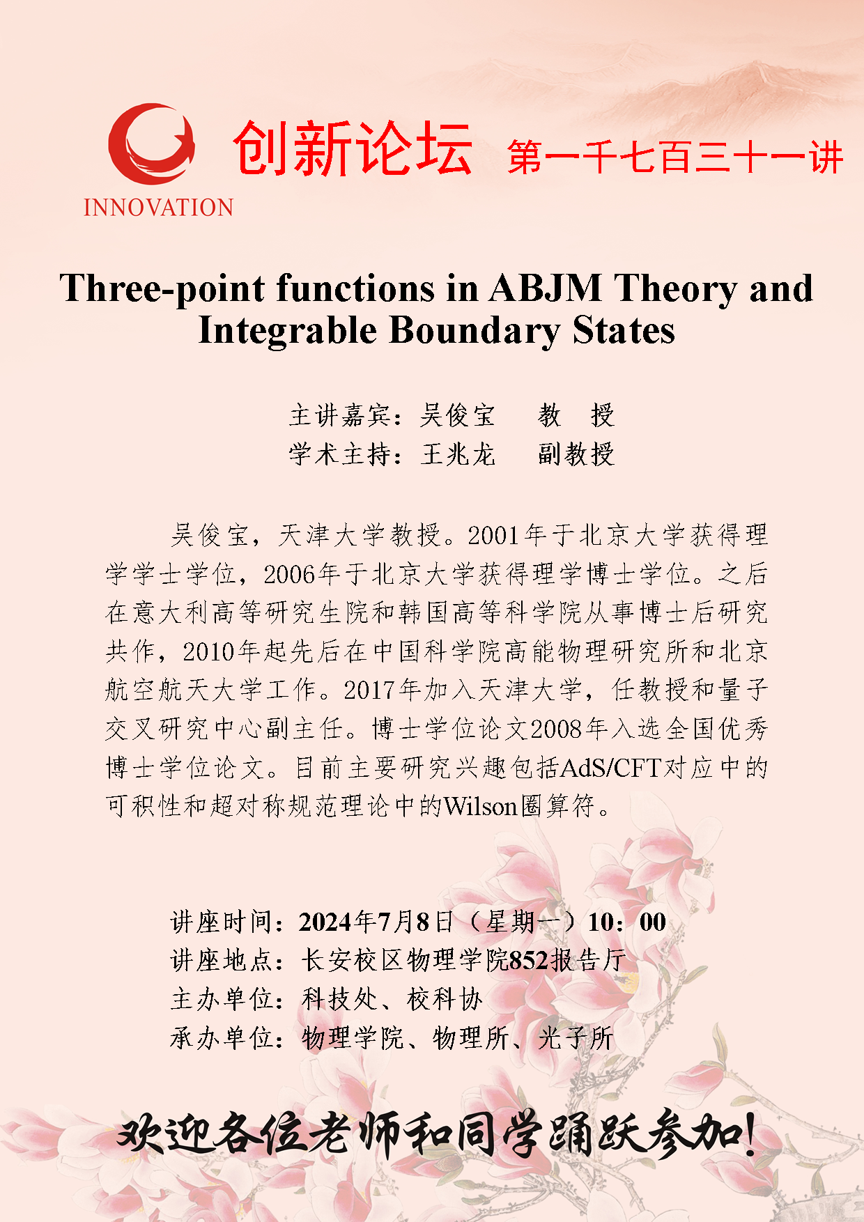 吴俊宝 教授 welcome欢迎光临威尼斯集团创新论坛第一千七百三十一讲:Three-point functions in ABJM Theory and Integrable Boundary States 讲座时间 2024年7月8日(星期一)10:00 讲座地点 长安校区物理学院852报告厅 讲座人介绍 吴俊宝 教授 讲座内容
