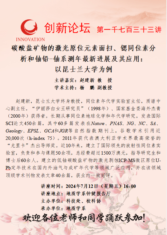 赵建新 教授 welcome欢迎光临威尼斯集团创新论坛第一千七百三十三讲:碳酸盐矿物的激光原位元素面扫、锶同位素分析和铀铅-铀系测年最新进展及其应用:以昆士兰大学为例 讲座时间 2024年7月12日(星期五)16:00 讲座地点 地质学系钟健报告厅 讲座人介绍 赵建新 教授 讲座内容