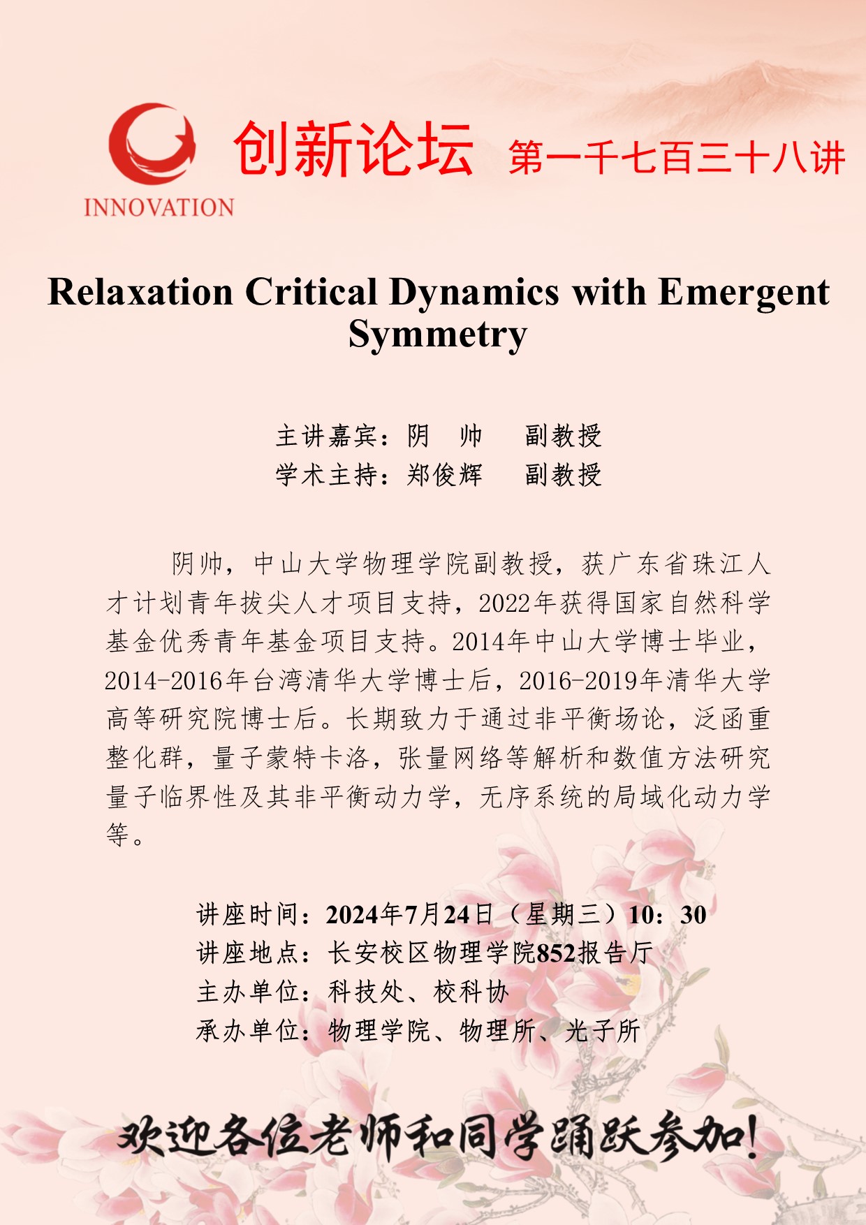 阴帅 副教授 welcome欢迎光临威尼斯集团创新论坛第一千七百三十八讲:Relaxation Critical Dynamics with Emergent Symmetry 讲座时间 2024年7月24日(星期三)10:30 讲座地点 长安校区物理学院852报告厅 讲座人介绍 阴帅 副教授 讲座内容